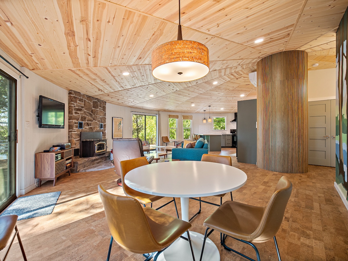 ¡Te damos la bienvenida a The Tree + House en Indian Point! Esta casa del árbol de lujo personalizada fue construida pensando en la comodidad y la relajación. Perfecto para un máximo de cuatro huéspedes, está rodeado de bosque y lleno de luz natural desde las ventanas del piso al techo que muestran impresionantes vistas del lago Table Rock. Te sentirás escondido en tu propio refugio privado, pero aún así estarás a solo minutos del agua y de Silver Dollar City. Es la mezcla ideal de naturaleza tranquila y estilo moderno.