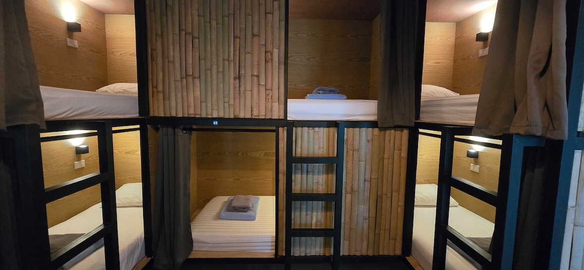One bed in a modern air-conditioned dorm at Ninja Camp, 3 min from Ban Tai beach. Your private pod includes blackout curtains, premium mattress, power outlet & reading light. Enjoy 1 free Muay Thai session per 2 nights, fast Wi-Fi, social lounge & on-site Thai restaurant. Perfect for solo travelers, digital nomads & fitness lovers seeking rest, training & community. Upgrade to full training or wellness packages with gym, sauna & recovery facilities. Your base for island adventure.
