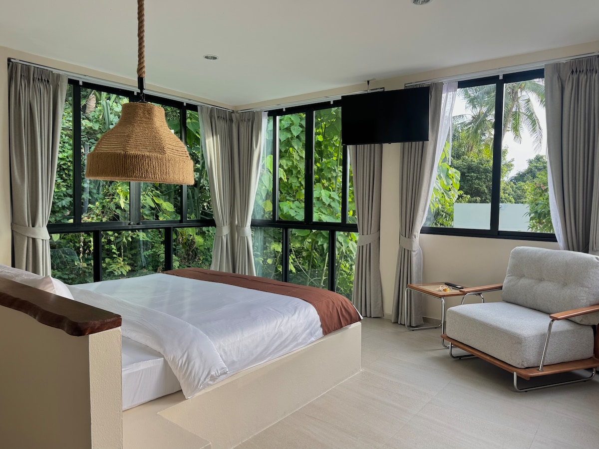 Vista privada al jardín de Bangalow Incluir: tamaño king. - Calentador de agua - Lavabo - Estufa eléctrica - Paleta - Refrigerador - Equipo de cocina Ofrecemos servicio de limpieza y cambio de sábanas / toallas una vez a la semana durante tu estadía. Bajo petición, se puede organizar un servicio de limpieza adicional. (400 baht adicionales/hora ) Para uso mensual: electricidad de pago independiente (10 THB/unidad).