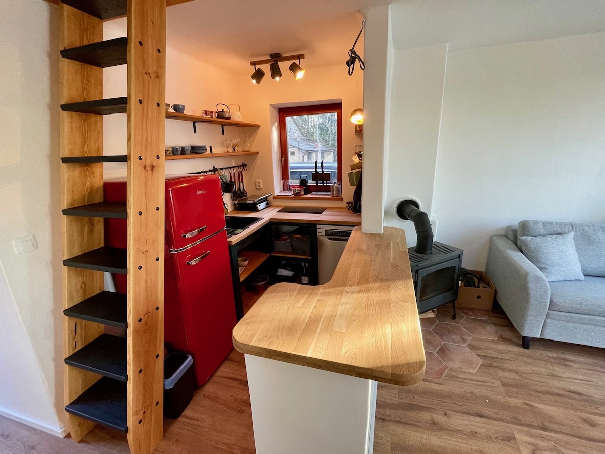 Ondřejka es una casa de diseño minimalista que solo puede caber en dos. Encontrarás todo lo que necesitas para tu estancia ininterrumpida, cocina con cocina, hervidor de agua y sudor Moka, remoska, nevera con congelador y delicias básicas (sal, pimienta, pimienta, especias, aceite, pasta, azúcar, café, té). Desde la cómoda cama doble puedes ver la puesta de sol y la puesta de sol.