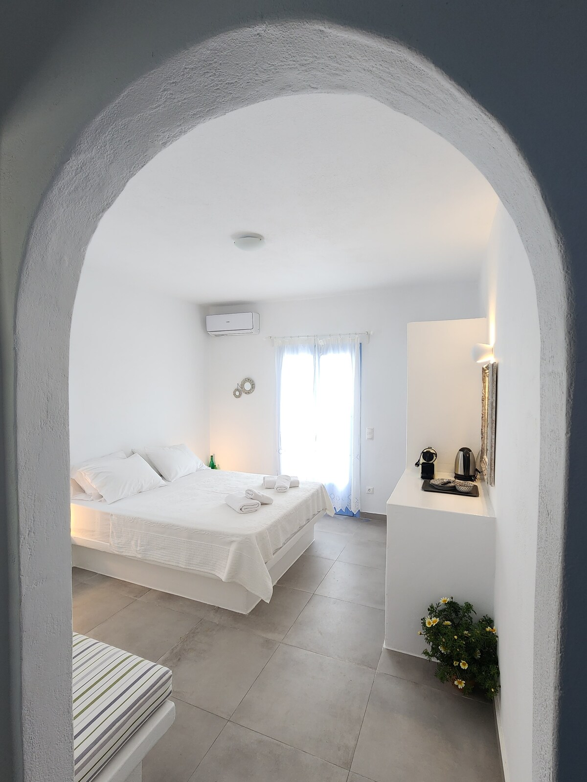 Es una casa tradicional de las Cícladas en el primer piso, independiente, con sus propias terrazas grandes con vistas al mar y maravillosas puestas de sol. Se encuentra en una ubicación muy tranquila a diez minutos a pie del pueblo. (Carretera pavimentada, iluminada). Cocina para cocinar y gran fregadero en el exterior. En una terraza hay una cama doble para tomar el sol o para dormir abrazado con... ¡las estrellas!