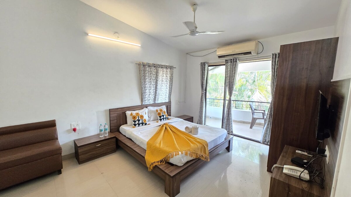 Esta habitación Deluxe con aire acondicionado y a un precio asequible en Lonavala es perfecta para disfrutar de una estancia cómoda y relajante. Tiene capacidad para hasta cuatro huéspedes y cuenta con una cama matrimonial, una cama individual y un colchón adicional. Perfecta para familias o grupos pequeños que buscan comodidad, practicidad y una excelente relación calidad-precio.