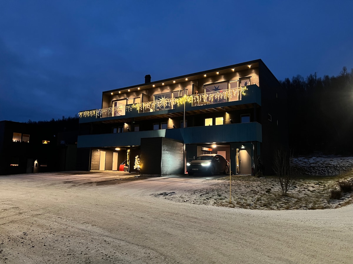 ¡Apartamento fresco y moderno de alto nivel! Construido en 2021. Cerca de la naturaleza para excursiones de montaña, esquí y remo. Haz kayak, sube a los picos de montaña más duros (o más fáciles) en excursión o a pie. La vida nocturna de Tromsø con fantásticos restaurantes a pocos minutos. 2 dormitorios dobles. Situado justo al lado del mar. A 12 minutos del aeropuerto, a 14 minutos del centro comercial más grande del norte de Noruega y a 20 minutos de la ciudad. Gran tienda de comestibles a 4 minutos. Sin farolas, sin tráfico, sin asfalto. ¡Bienvenido!