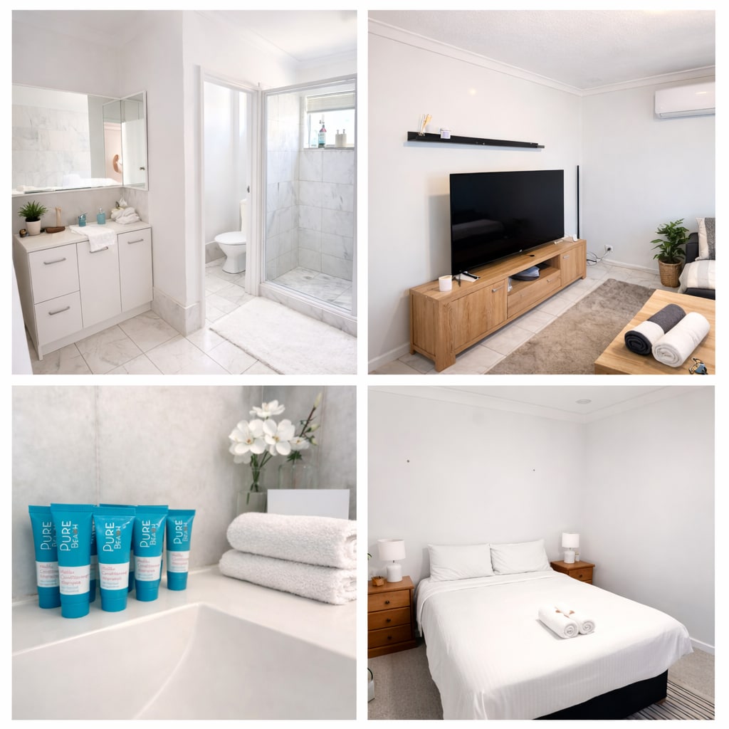 Comfortable queen bed with quality bedding Air conditioning cooling & heating Fully equipped kitchen with microwave, smeg kettle,full size fridge freezer, gas hotplate and oven Flat screen built in wall TV Comfortable 3 seater couch,ottoman and armchair Cute 2 seater dining nook, the perfect spot for that morning coffee while taking in the views of the ocean Renovated bathroom with hairdryer, bath towels, body wash Wifi Top floor NO KIDS