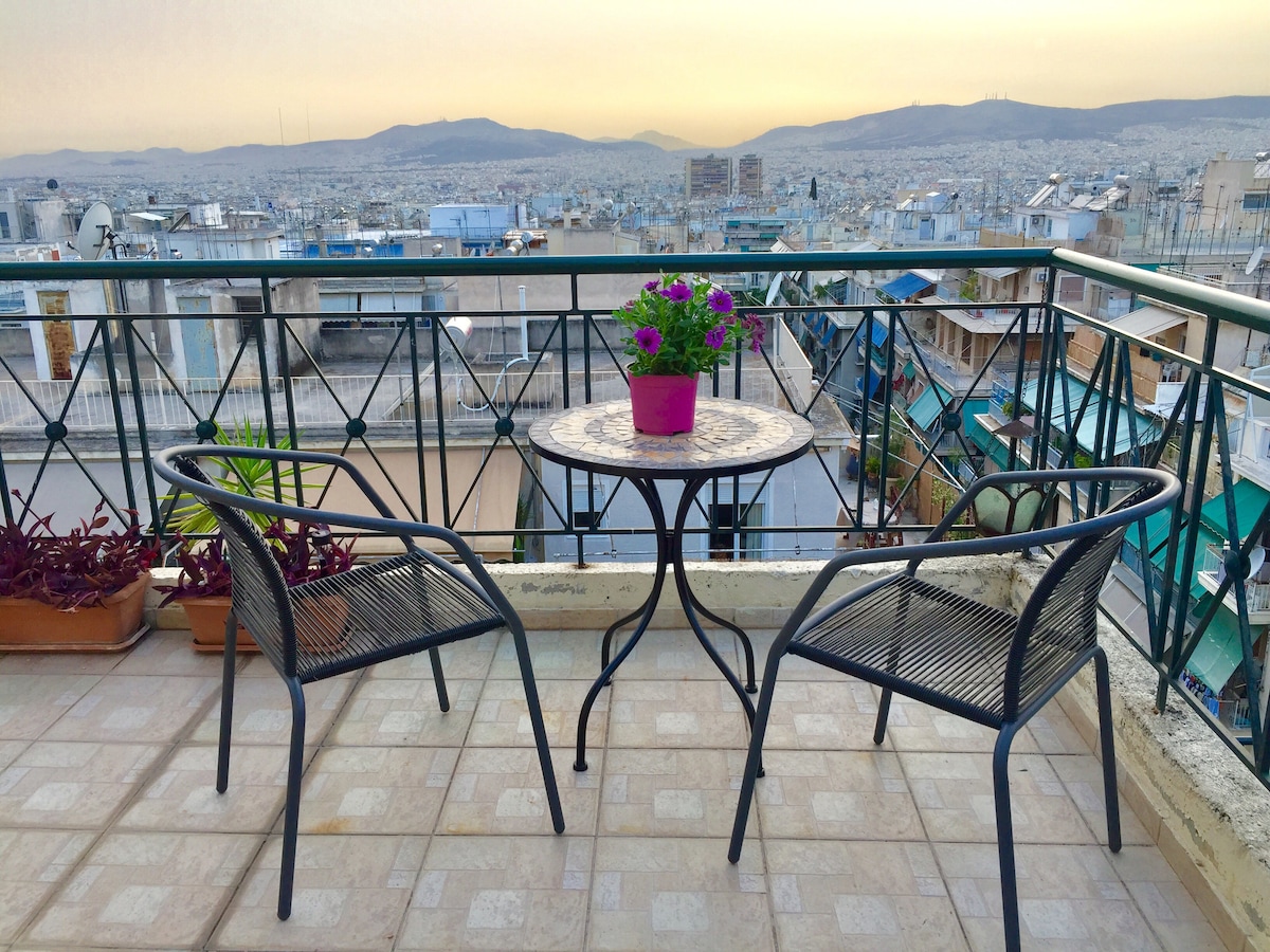 A solo 250 metros de la estación de metro de Metaxourgio, este ático es un verdadero hogar acogedor, no un alquiler turístico típico y se permite fumar. Tiene un dormitorio soleado, una cómoda sala de estar con pared de cristal con vistas a Atenas, cocina totalmente equipada, wifi gratuito, TV de plasma, terraza soleada, lavadora y secadora, plancha, aire acondicionado, supermercados, cafeterías, bares, farmacia y tabernas. Como a veces vivo allí, puedes encontrar todo lo que necesitas, desde aspirinas hasta pasta de dientes y zapatillas.