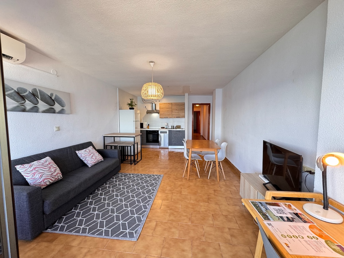 Relájate y desconecta en este apartamento en PRIMERA LÍNEA de playa de estilo mediterráneo, cómodo, funcional y práctico Dispone de Salón con cocina totalmente equipada, dos dormitorios de matrimonio con camas de 1'50 y 1'35. Un sofá cama en el salón. Un baño completo. Televisión con acceso a Internet, lavadora, secadora, cafetera, tostador, aire acondicionado. Sabanas y toallas incluidas. Se encuentra en un enclave privilegiado con multitud de servicios, bares, terrazas, tiendas...
