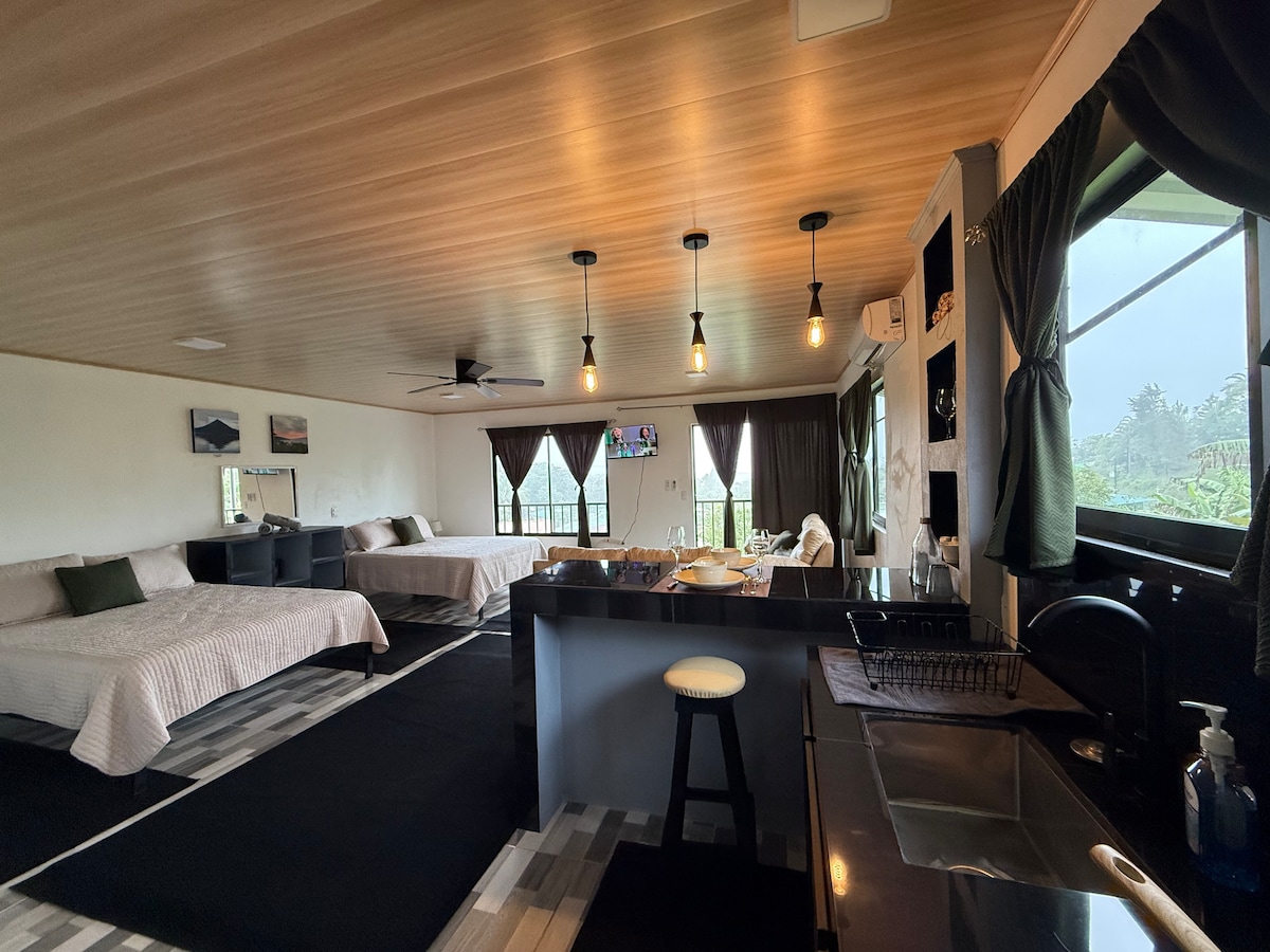 A modern loft style 1 bedroom, 1 bathroom with modern luxuries and furnishings located 15 minutes outside of La Fortuna Town. Pool on site and outside seating area. With many amazing hot springs just 20 minutes away. Our newly built modern home offers air conditioning, stainless steel appliances within a gated community. King size bed, high speed internet, Smart TV, outside pool furniture, washer/dryer. Breakfast included for stays less than two weeks. On site spa and hair salon.