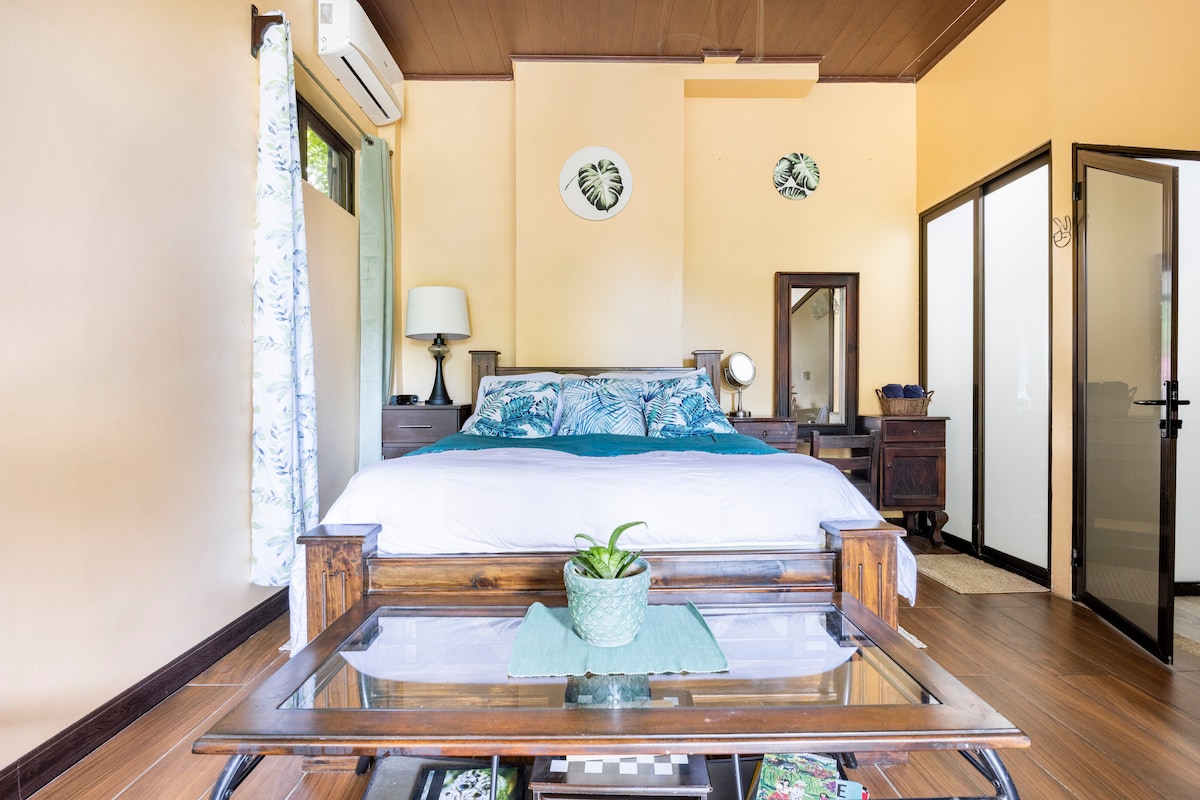 Hotel Boutique Casa del Río Amplia villa familiar ideal para familias o grupos pequeños. Cuenta con dos dormitorios, uno con una cama tamaño king y dos camas individuales, el otro con dos camas tamaño queen, cada uno con aire acondicionado y una decoración elegante. Incluye dos baños completos, una cocina totalmente equipada y un balcón privado rodeado de jardines tropicales. Los huéspedes disfrutan de acceso a todos los servicios del Hotel Boutique Casa del Río y de un desayuno de cortesía con vistas al volcán Arenal.