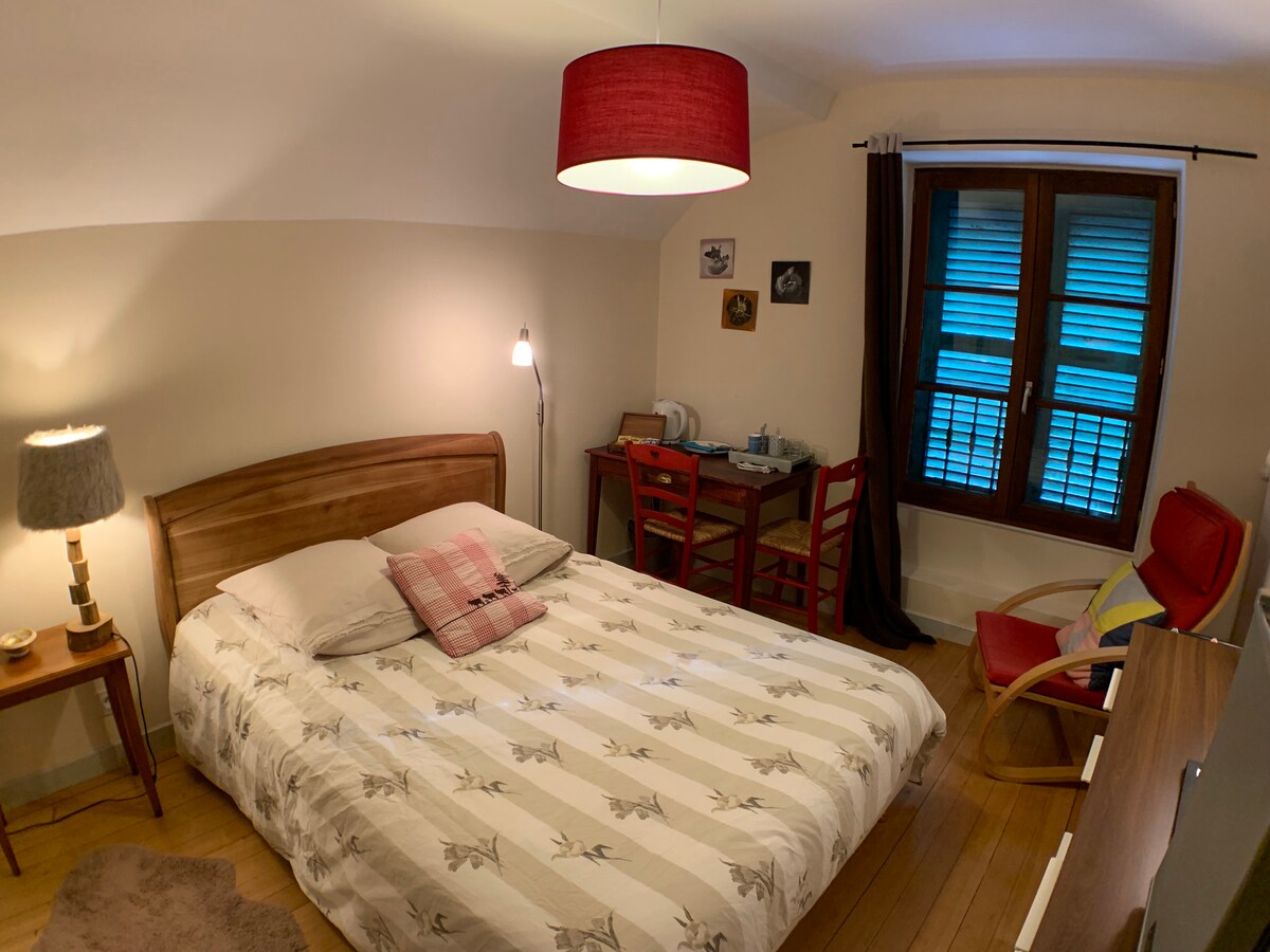Una habitación renovada con encanto y elegancia en un ambiente acogedor, dentro de mi casa. Se encuentra en el piso de arriba con un baño privado, con ducha e inodoro. El acceso a esta se realiza a través de mi apartamento. Entorno tranquilo y silencioso. A modo de indicación, el desayuno no está incluido ( pero se puede ofrecer por un suplemento).