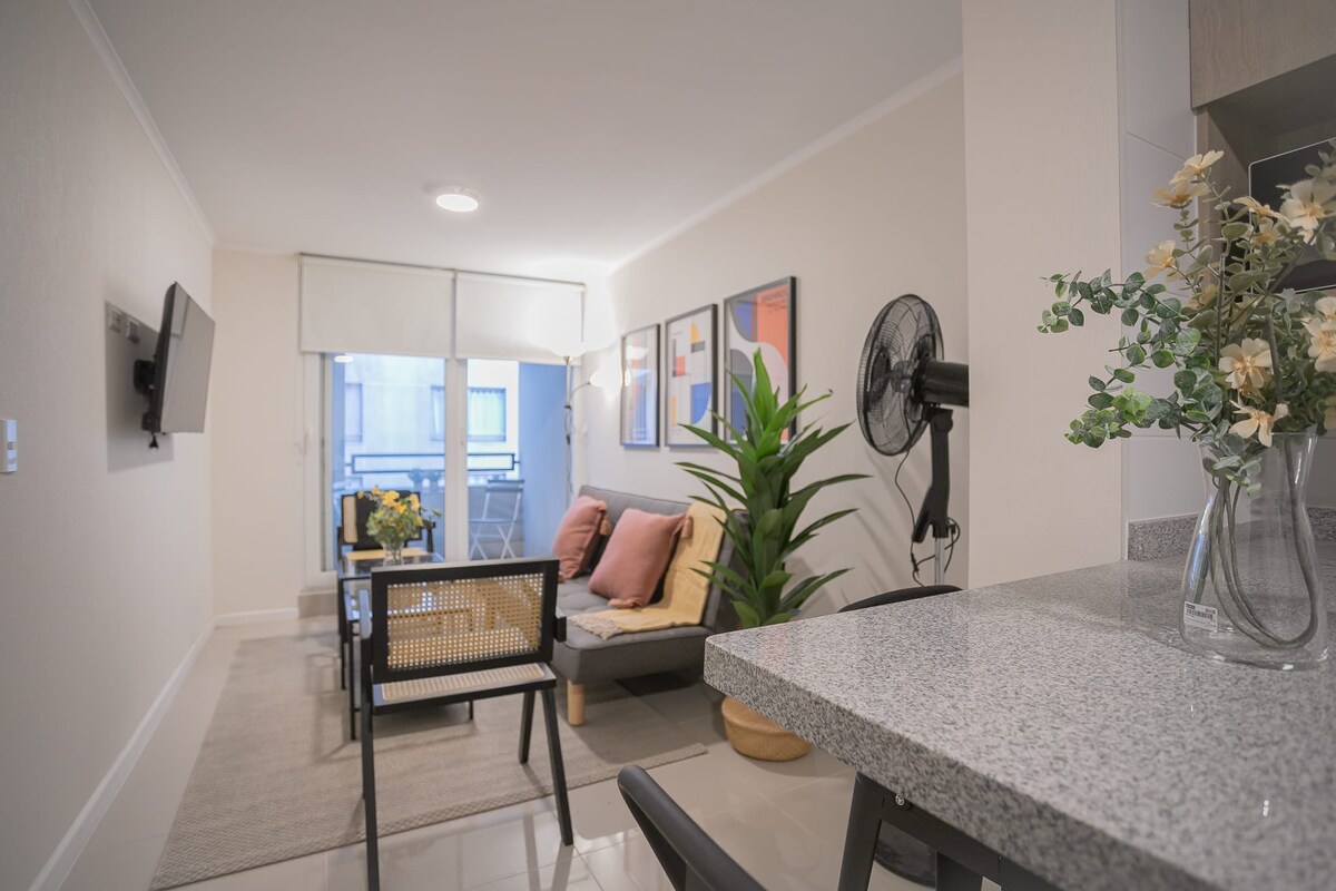 Apartamento nuevo para estrenar, perfecto para hasta 3 huéspedes. Cuenta con un dormitorio principal equipado con una cama doble y un moderno baño completo. La cocina, abierta al living, está equipada con lo necesario para preparar comidas y compartir momentos agradables. El salón incluye un cómodo sofá (ideal para el tercer huésped) y un televisor disponible para el entretenimiento. El diseño es moderno y minimalista, con detalles cálidos y terminaciones de calidad.