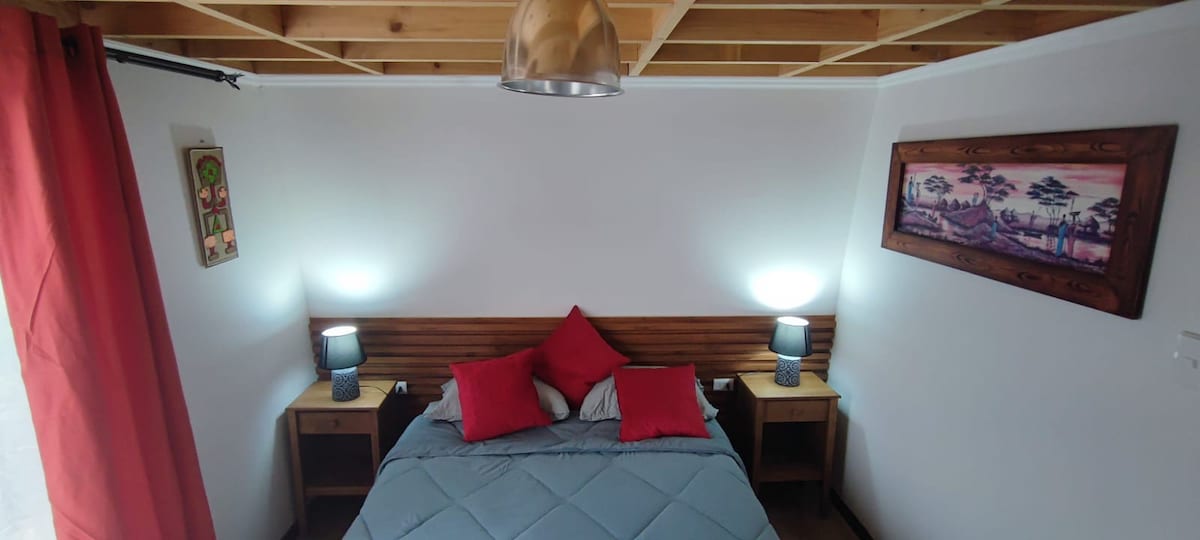 Acogedora cabaña con preciosa vista para 4 personas ubicada en el sector de Lomas de Monardez, a 1 km de la ruta 41. 2 dorm, 1 cama de 2p. 2 camas de 1 p-. 2 futones (más de 4 pax se cobra huésped adicional)A 8 - 15 min del centro de La Serena, a 5 m del aeropuerto, 15-20 minutos de la Av. del Mar.y a medio camino hacia el Valle. En lo posible, venir en vehículo. Sino, pueden pedir uber. Se aceptan hasta 2 mascotas gratis, por lo mismo deben ser cuidadosos con la limpieza. Sin wifi.