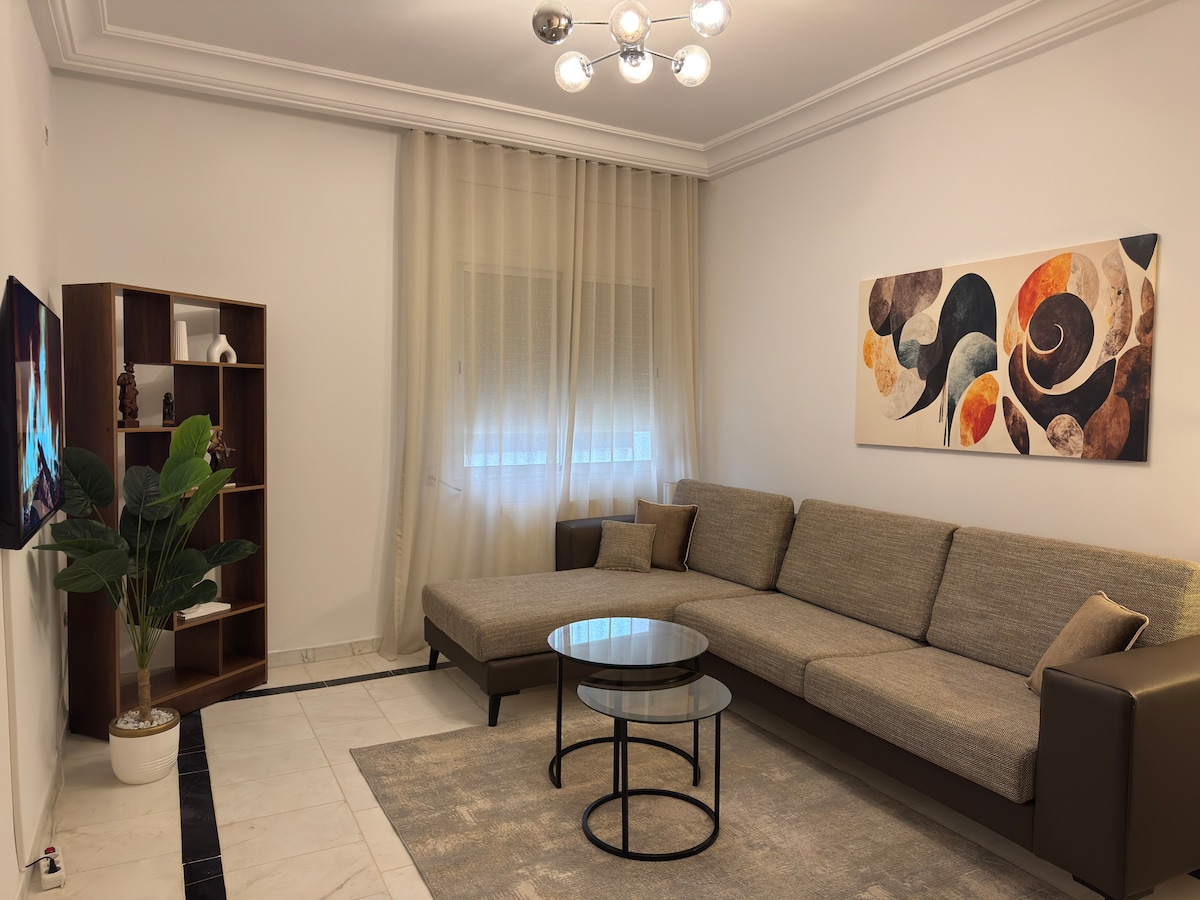 😊 Bienvenido a su hogar lejos de casa en Aouina. 🌟Luminoso, moderno y cómodo, es la opción ideal para disfrutar de Túnez con estilo, sin explotar su presupuesto. 📍A solo: 8 minutos de La Marsa, 7 minutos del aeropuerto Cerca de tiendas y restaurantes Los ➕ : Estacionamiento privado en el sótano. Edificio seguro con conserje las 24 horas. Wifi, aire acondicionado, cocina equipada. ¡Deje sus maletas, salga a explorar! 🇹🇳 Perfecto para un viaje relajante a la ciudad o una estadía profesional con estilo 💖