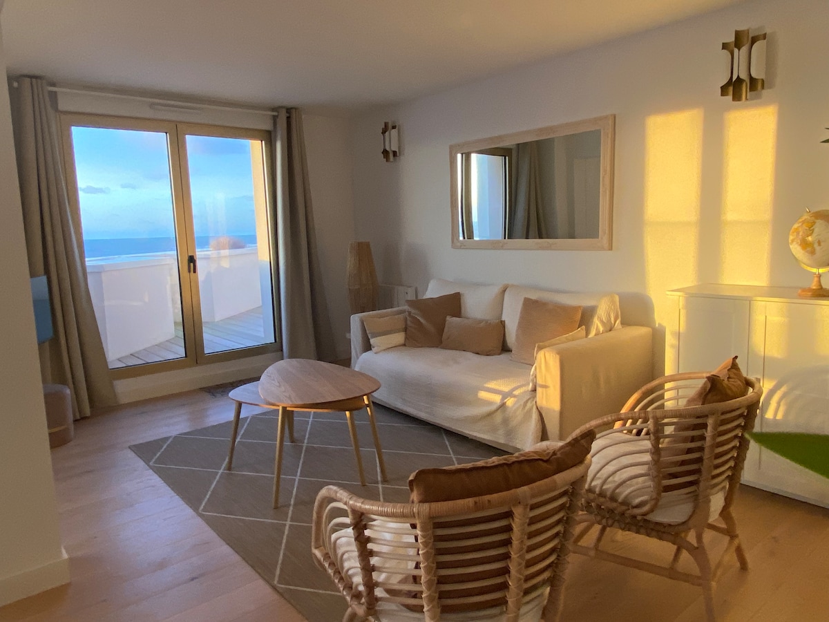 Pequeño capullo paradisíaco con vistas al mar. Me encanta la terraza cerrada para disfrutar de las vistas a las olas en cualquier clima. Completamente renovado por nosotros, nos aseguramos de que pudiéramos ver el mar desde cualquier lugar del apartamento (sí, sí, incluso desde la ducha ...) Acceso directo a la playa en una residencia tranquila, a pocos minutos a pie de tiendas / restaurantes. El lugar perfecto para un paréntesis entre amantes...
