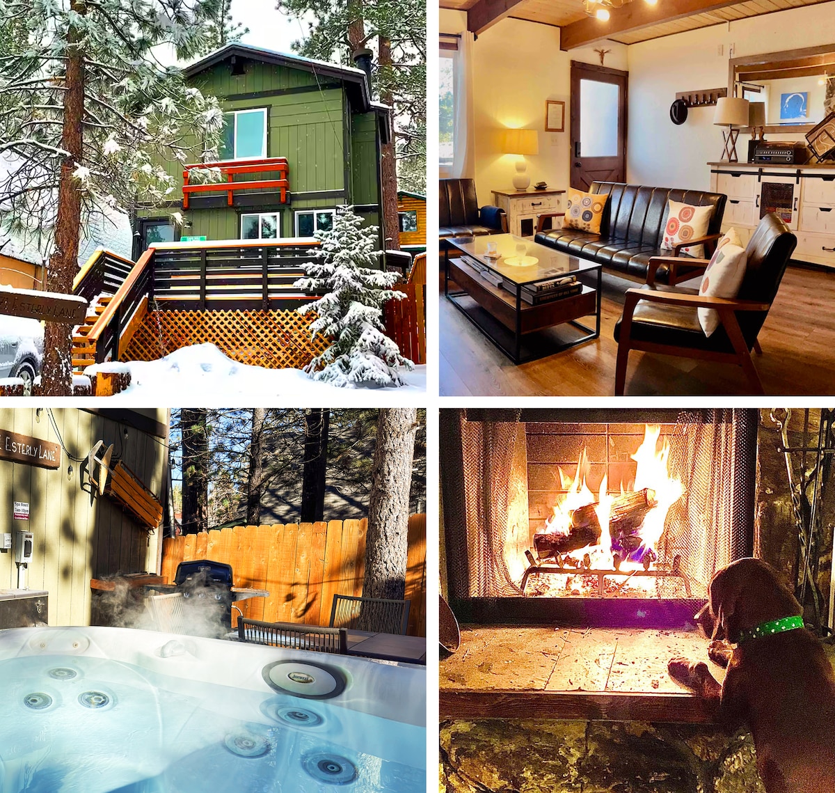 Enjoy complimentary coffee k-cups and sit around firepit, enjoying mountain fresh air in our unique adventure cabin named after "Stubbs" our "pup" - your hub for all Big Bear Lake fun ! Chill on front deck with soaring pines, private backyard, dining area, chaise lounges, HOT TUB, firepit & BBQ; or snuggle inside with a wood-fire and movie. Tastefully remodeled, modern. Open floor plan, with indoor, wood-burning kettle-fireplace and loft. Free, 2-car driveway (off-street parking only)