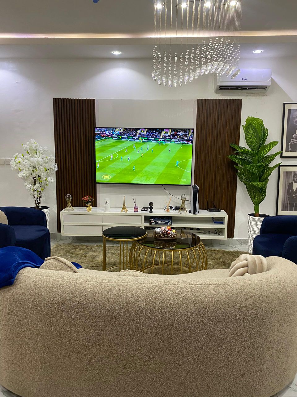Amplia sala de estar y habitación real con cama tamaño king, baño moderno y aseo🚽. Apartamento muy limpio y estándar. Royal Pent House te ofrece todas las comodidades modernas más allá de tu imaginación con wifi de alta velocidad ilimitado, TV inteligente de 43 pulgadas en el dormitorio y TV inteligente de 55 pulgadas en la sala de estar, YouTube, Netflix, DSTV. Cómodo sofá, calentador de agua, hervidor de agua, microondas, gas para cocinar. Alarma de humo, alarma de dióxido de mono, energía 24/7. CCTV, máxima seguridad con personal de seguridad las 24 horas, 7 días a la semana.