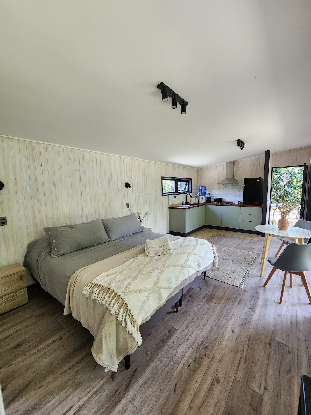 Bienvenido al sur de Chile, cercano a la ciudad de Puerto Varas, a tan solo 7 kilómetros por Ruta 225 Camino a Ensenada, podrás gozar del Lago Llanquihue y su hermoso paisaje natural de bosques y volcanes. Te recibimos en una cómoda y rústica Tiny Home completamente equipada para una pareja. Aprovecha el acceso directo a la playa y atrévete a navegar en kayak o pasear en bicicleta por la Ruta Escénica Lago Llanquihue.