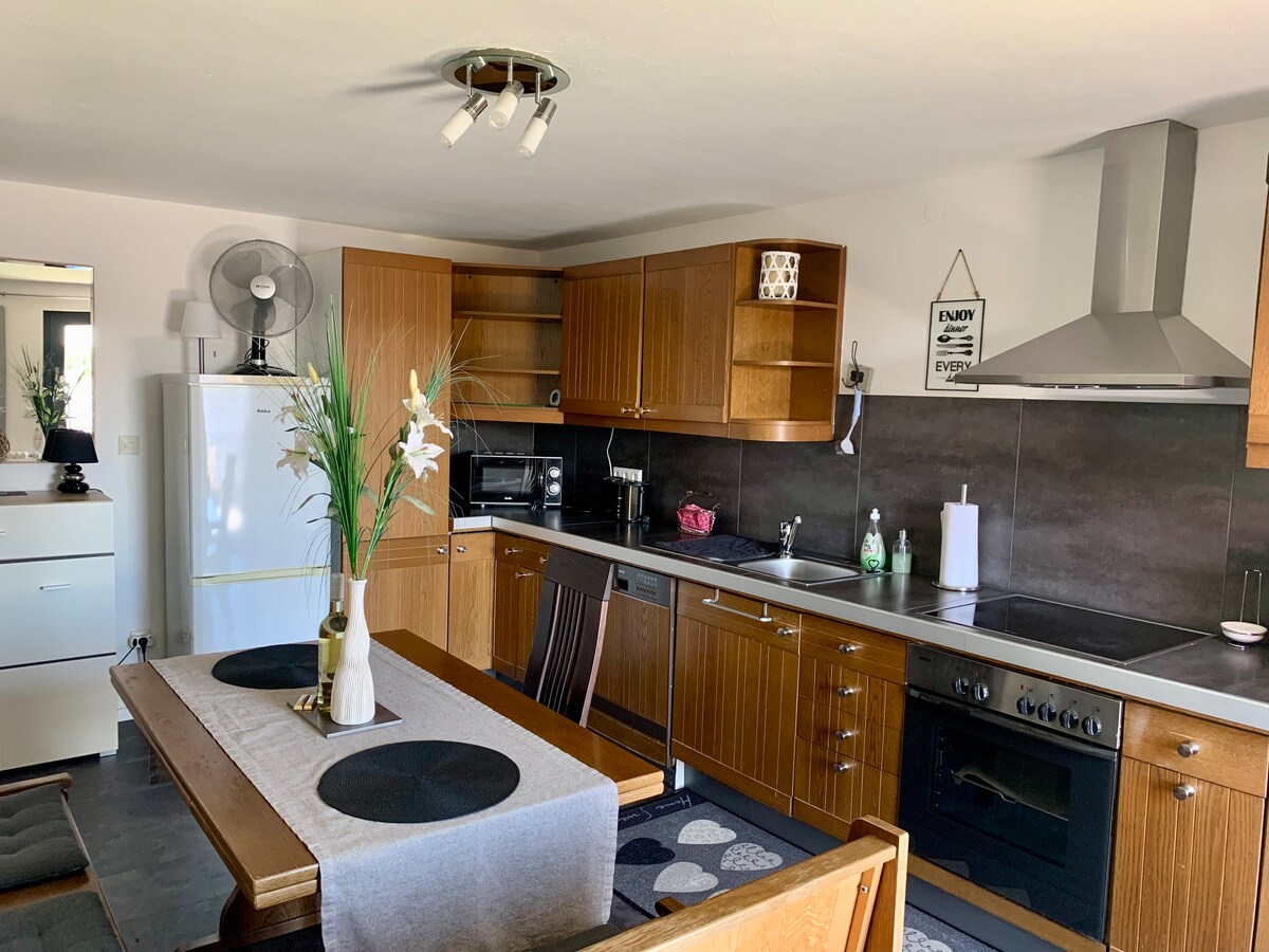Pasarás tu estancia en un apartamento colorido y acogedor, que tiene entrada privada. En la terraza cubierta de 20 metros cuadrados con salón frente al apartamento, puedes disfrutar de la vista del jardín, barbacoa, comer o simplemente relajarte. El departamento de aproximadamente 54 metros cuadrados está ubicado en el primer piso de nuestra casa para 2 familias. Todas las ventanas del departamento están equipadas con mosquiteros. Hay estacionamiento gratuito disponible.
