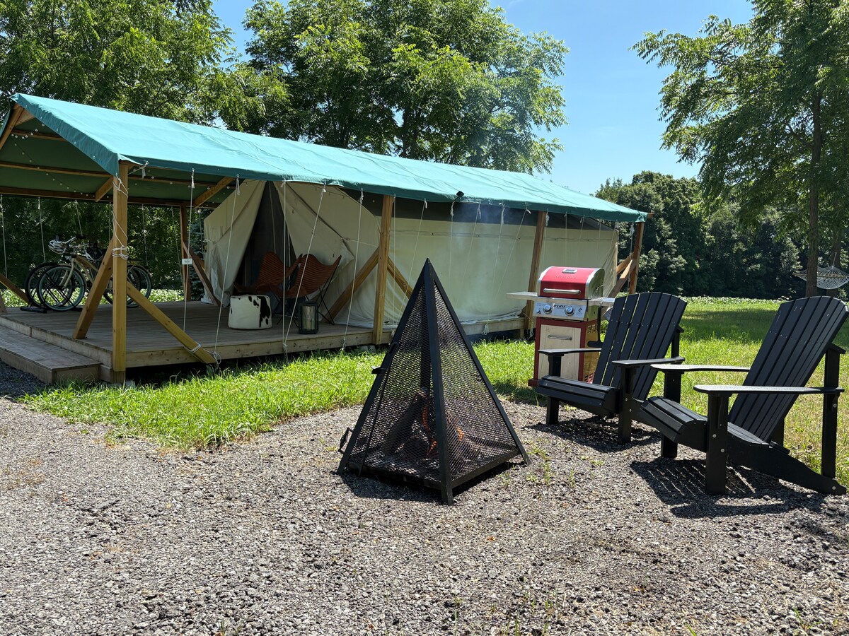 ¡Escápate a nuestro oasis lleno de naturaleza en 25 acres de granjas privadas! Sumérgete en la naturaleza sin sacrificar la comodidad. Nuestra tienda de campaña cuenta con un acogedor cama tamaño king, baño al aire libre, barbacoa y chimenea. Rodeado de impresionantes vistas de la naturaleza y las tierras de cultivo. Explora rutas de senderismo y bodegas cercanas, disfruta contemplando las estrellas junto al fuego o simplemente relájate y reconecta con la naturaleza. Si buscas una escapada romántica, nuestra experiencia de glamping se adapta a tus expectativas.