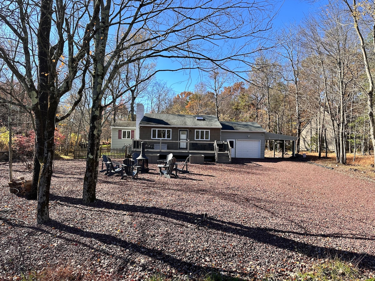¡Ven a nuestro pequeño paraíso de Pocono! Nuestra comunidad cerrada cuenta con 5 lagos diferentes, canchas de baloncesto, pesca, piscinas y parques infantiles para los más pequeños. Tenemos una familia de ciervos que residen aquí, y aunque la caza no está permitida en nuestra comunidad, estamos a 15 minutos de State Gamelands 129. A 10 minutos de Pocono Raceway, a 20 minutos de Jack Frost y Boulder para esquiar, a 25 minutos del centro vacacional Split Rock y a 5 minutos de Skirmish Paintball. Tenemos juegos al aire libre, asientos, un jacuzzi y una acogedora sala de cine.