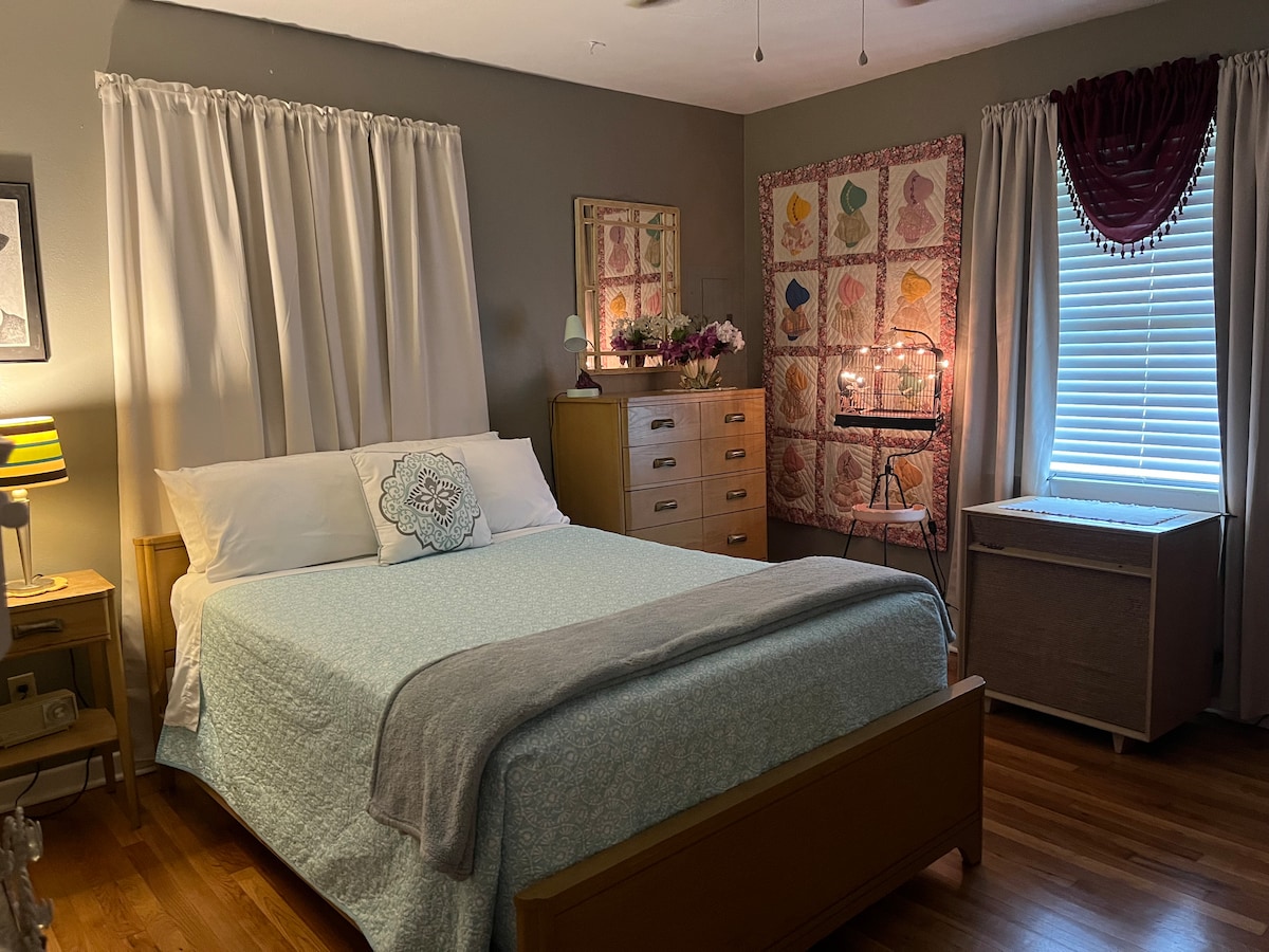 Disfruta del estilo de vida bucólico de esta pintoresca cabaña que está junto a un prado y un estanque. Cuando el clima lo permite, tenemos un fogón que puedes usar para hacer S'mores justo enfrente de tu cabaña. Te damos la bienvenida aquí para que disfrutes de un descanso durante tus viajes o tal vez necesites un lugar tranquilo cerca del hospital. Estamos a 2 millas del centro histórico y cerca de parques y lagos. Además, prepararé el desayuno para ti y entregaré a domicilio en tu puerta. (Los horarios para la entrega del desayuno son de 8:30 a 10:00 a. m., solo tienes que decírmelo:)
