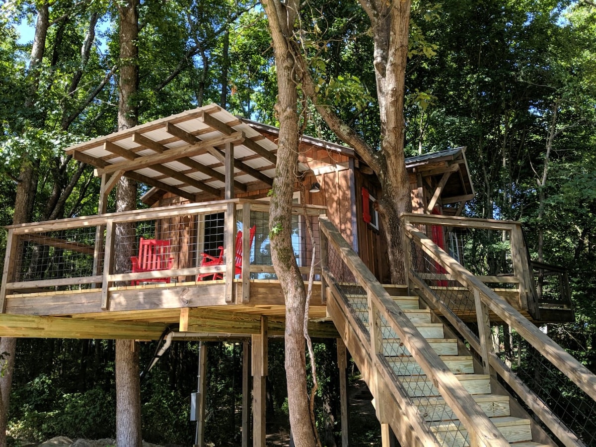 Esta hermosa casa del árbol es la quinta en la propiedad Cherry Treesort. Se encuentra junto a la carretera principal a un corto paseo sobre el pintoresco puente. Cuenta con una cama tamaño queen en el dormitorio principal, así como un sofá cama queen extraíble. Tiene un baño completo con inodoro y ducha. También tiene microondas, tostadora, Keurig y nevera. La calefacción y el aire acondicionado también son un lujo en esta casa. En los terrenos fuera de la propiedad tenemos una gran fogata rústica con un montón de columpios al aire libre y hamacas.