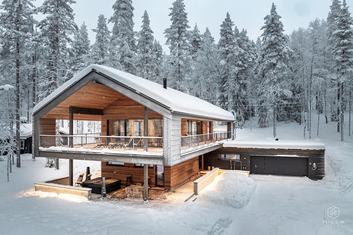 Luxury Villa Valo – Modern Chalet (190m2) in Levi Completed in 2024, Luxury Villa Valo offers 3 bedrooms, a loft, sauna, outdoor hot tub, home cinema, and a cozy living area with fireplace and panoramic views. Smart amenities, Wi-Fi, EV charging, and ski storage add convenience. Just 2 km from Levi centre and 13 km from Kittilä Airport, it’s perfect for families and groups seeking comfort and Lapland experiences. Bed linen, towels, and final cleaning included.
