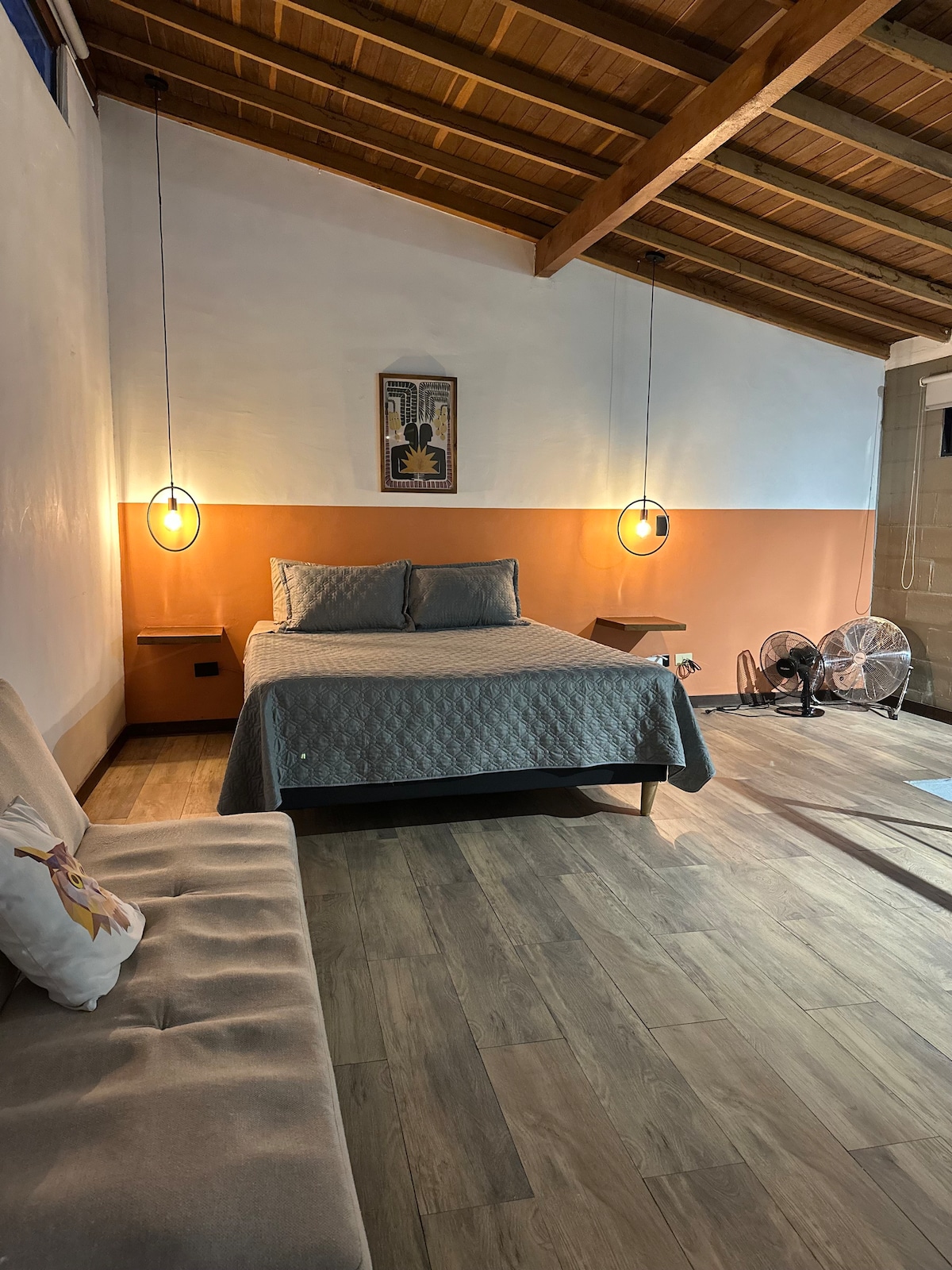 Light, Design & Local Living in the Heart of Laureles Welcome to a bright and peaceful loft designed for comfort, creativity, and connection. This space is perfect for couples, solo travelers or remote workers who want a stylish base in one of Medellín’s most authentic neighborhoods. 🛏️ Comfortable bed with premium mattress & 100% cotton sheets 💻 Dedicated workspace with fast 200 Mbps internet 🌬️ Air conditioning + natural cross-ventilation through floor-to-ceiling windows