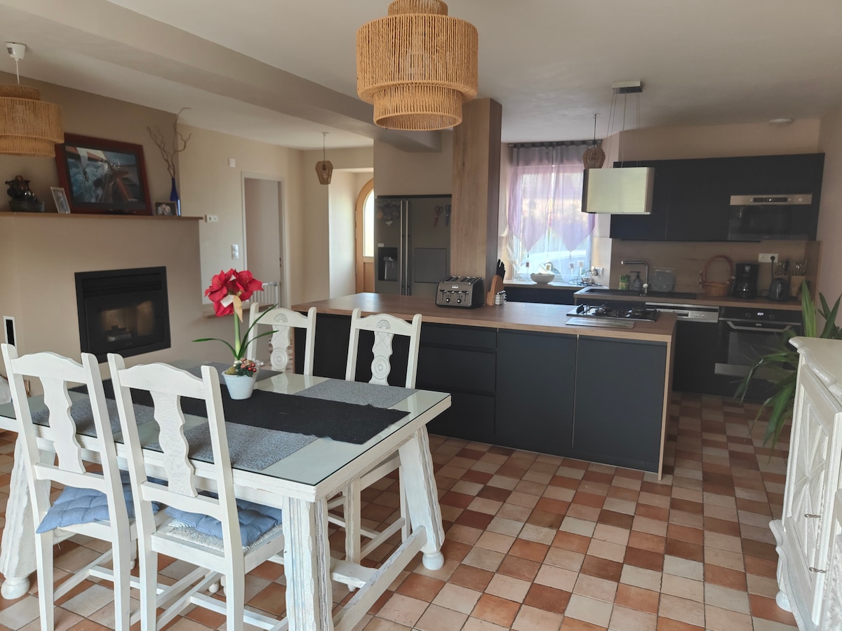 Casa contemporánea luminosa y muy espaciosa. Terraza con vistas a un bonito panorama ,que invita a la relajación . Una cocina equipada con horno eléctrico, gas, heladera, lavavajillas, microondas, vajilla le permitirá si lo desea preparar una comida o a petición a la llegada y con un suplemento , un desayuno (4 €/ persona) o una cena (12 €/ persona) se le puede servir de acuerdo a su elección.