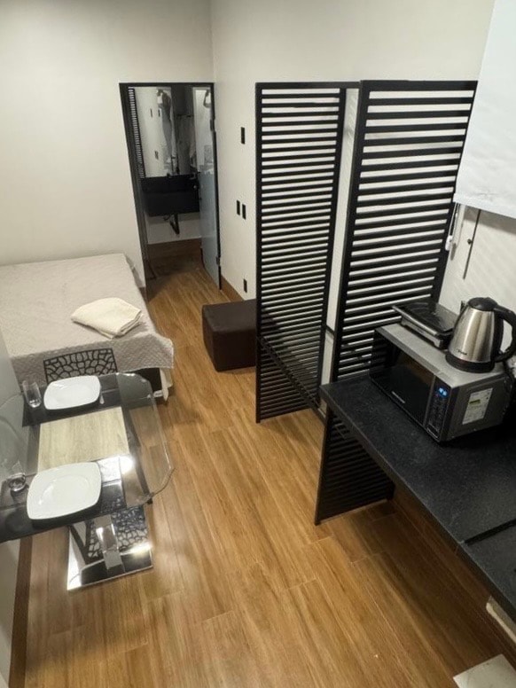 Gimnasio en el edificio🏋️. Nuestro moderno y acogedor estudio está a 1,3 km de la UFLA, a 1,1 km de Unilavras y a 600 m del centro. Tiene aire acondicionado❄️, una cocina equipada 🍳 y una zona de trabajo💻. En el edificio: gimnasio🏋️ 👥, coworking, cocina al aire libre 🍽️ y lavadora y lavandería seca (se paga por separado)🧺. Ideal para aquellos que buscan practicidad en estancias de trabajo, estudios o ocio en Lavras. Perfecto para pruebas, congresos y negocios. Quédate con comodidad, seguridad y movilidad. ¡Sin salir de tu rutina!