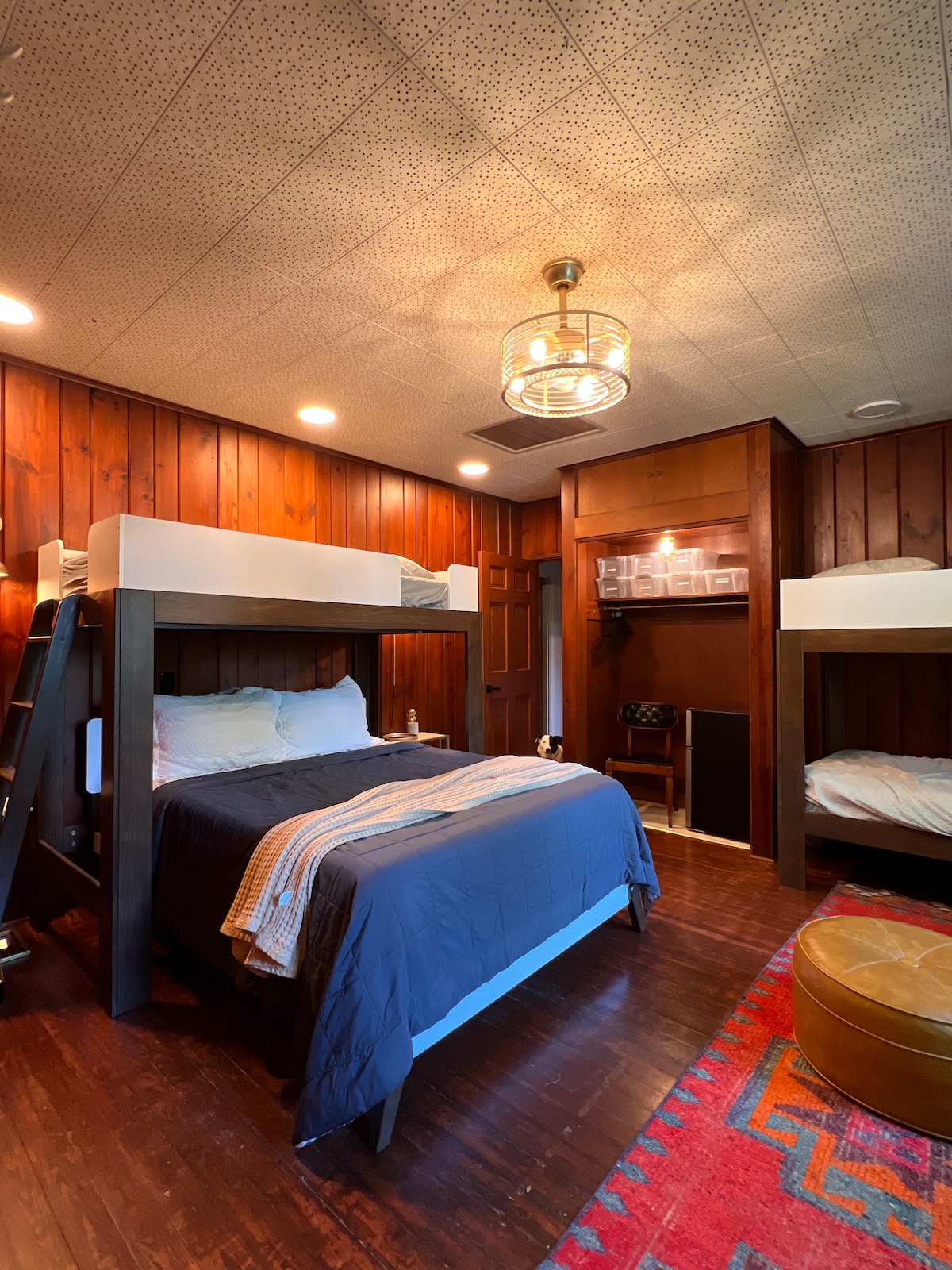 Amish Paradise tiene un concepto de planta abierta con la sala de estar, el comedor y la cocina en el primer piso. Hay 3 dormitorios en el segundo piso. Subiendo las escaleras tenemos una vista lateral que mira por una ventana arque da al bosque. Sin embargo, nuestra parte favorita de esta casa son las vistas desde la cubierta envolvente. ¡Tiene una vista espectacular de nuestra propiedad y más allá, hasta el parque Marti! ¿Mencioné que esta casa fue una vez una verdadera casa Amish?😉