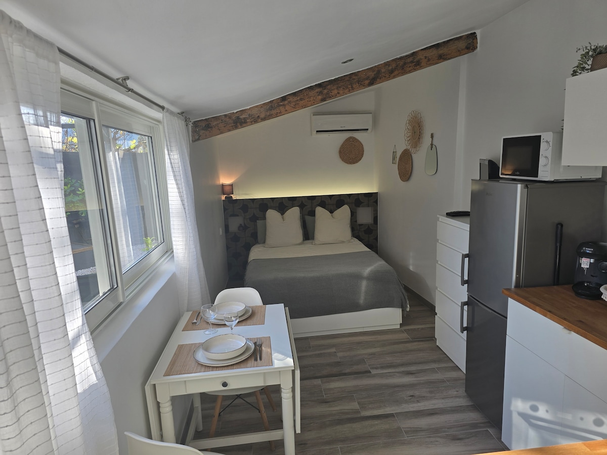 Estudio reformado de 25 m² con jardín, dentro de una villa cercada. El estudio es independiente. Jardín privado vallado para relajarse al sol. Aparcamiento gratuito en la calle situada frente a la casa. Zona residencial tranquila a 5 minutos en coche de la gran playa de arena de Lecques. Muy cerca del pueblo de St. Cyr, tiendas y restaurantes (5 minutos a pie), y viñedos. Cocina equipada con lavavajillas, horno y vitrocerámica...