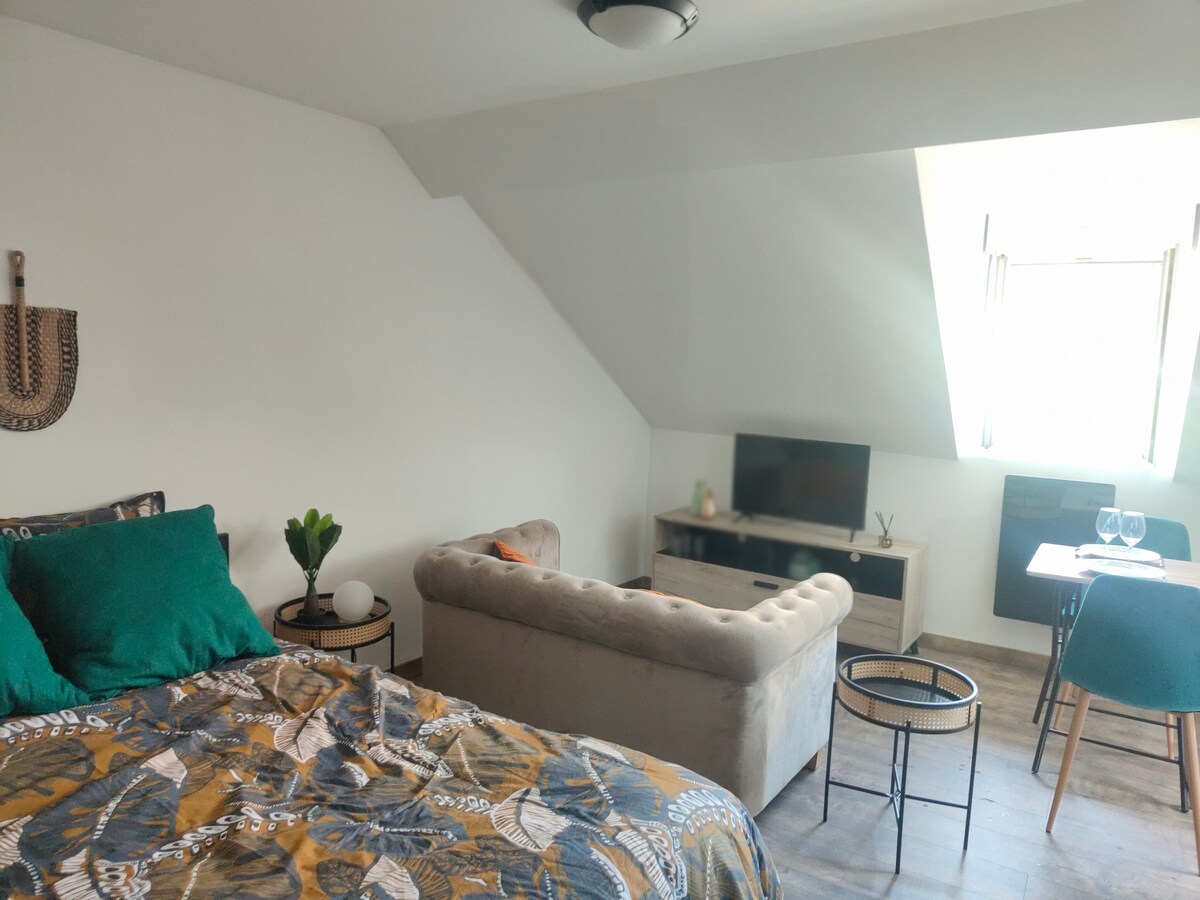 Estudio cálido y moderno situado cerca de múltiples tiendas y a 15 minutos a pie del centro de la ciudad de Le Mans. Bienvenido a mi apartamento situado en el tercer piso con ascensor en una residencia tranquila. Una plaza de aparcamiento privado en la urbanización está a su disposición. Este estudio consta de una amplia sala de estar con una bonita cocina abierta equipada, con café, té y condimentos a su disposición. También dispone de un baño con bañera.