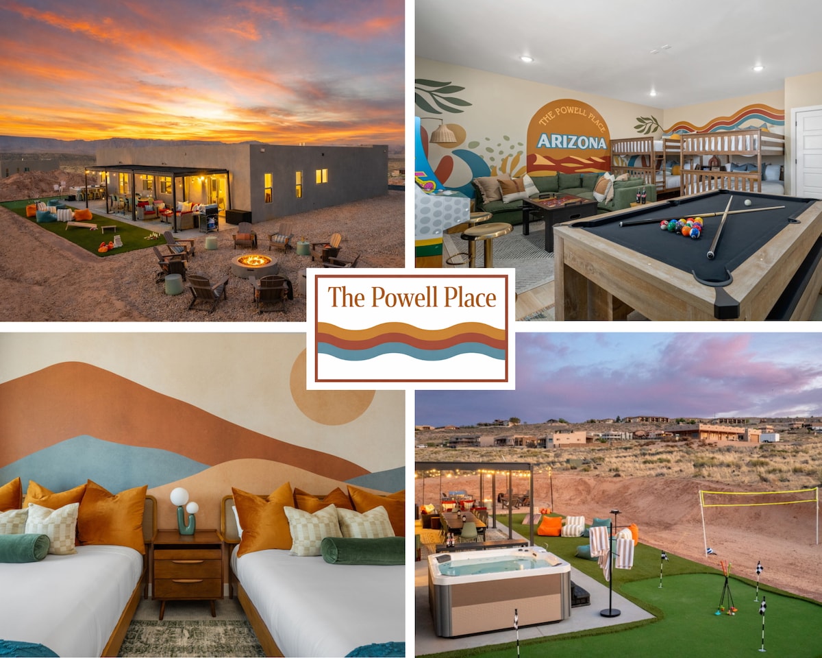 Unwind at Horizon Retreat for your next Lake Powell adventure. This NEW 4BR/2.5BA adobe-style home sleeps 15 and offers stunning desert vistas and modern Southwestern finishes. Minutes from Wahweap Marina, Lone Rock Beach, Horseshoe Bend, Antelope Canyon & more. The perfect hub for day trips to the Grand Canyon, Zion, and Bryce Canyon. Enjoy sunset views from the hot tub and patio, game room (ping pong & pool), gourmet kitchen, and TVs in every room. Ideal for families & groups.