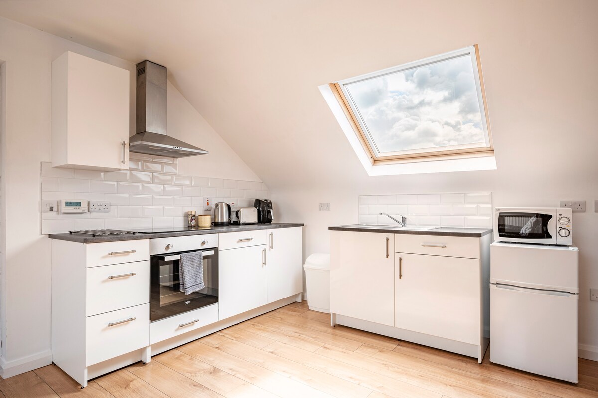 Apartamento loft luminoso, espacioso, alegre y bien decorado, un dormitorio con cama tamaño king y sofá que se convierte en una cama individual (3' 6" de ancho) o doble (4'8") en la sala de estar. Hay una ducha en suite con w.h.b y WC. Una cocina moderna totalmente equipada con nevera, lavadora, placa eléctrica, horno microondas, hervidor de agua y tostadora. Televisor Sky Q de pantalla plana de 46 pulgadas (todos los canales) junto con wifi gratuito. Tenemos 3 alojamientos separados (con capacidad para 9 a 10 personas, no se admiten despedidas de soltero/a).