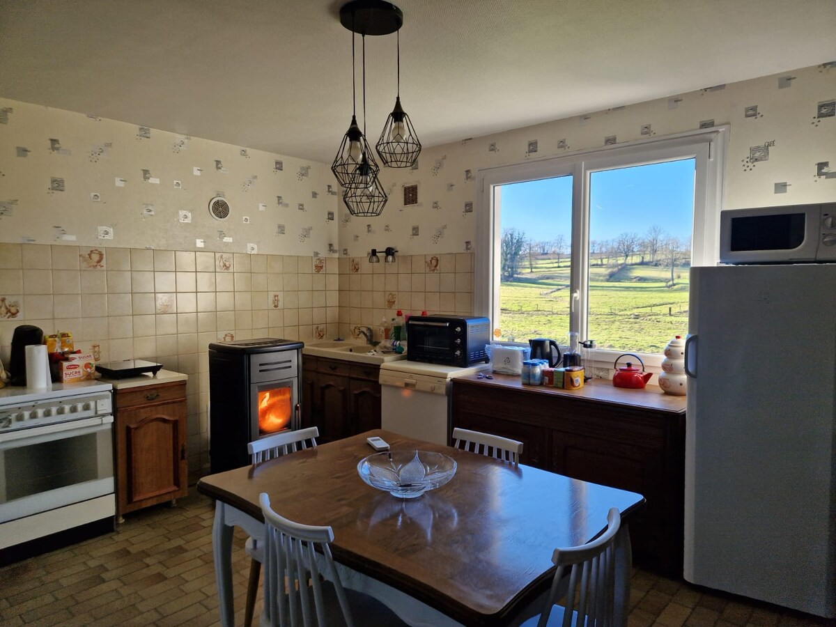 Dispone de una habitación privada con baño y aseo y una sala de estar con un sofá cama, así como una zona de cocina dentro de una gran y auténtica casa de Creuse. Situado en un pequeño pueblo tranquilo y apacible en el campo. Para visitar: Aubusson (Ciudad Internacional del Tapiz a 30 minutos) Vulcania (parque temático en el corazón de los volcanes de Auvernia a 50 minutos), descubrimiento de Clermont-Ferrand y la Cadena de los Puys (Puy-de-Dôme, Puy de Sancy) Mas du Clos a 20 minutos (circuito automovilístico)