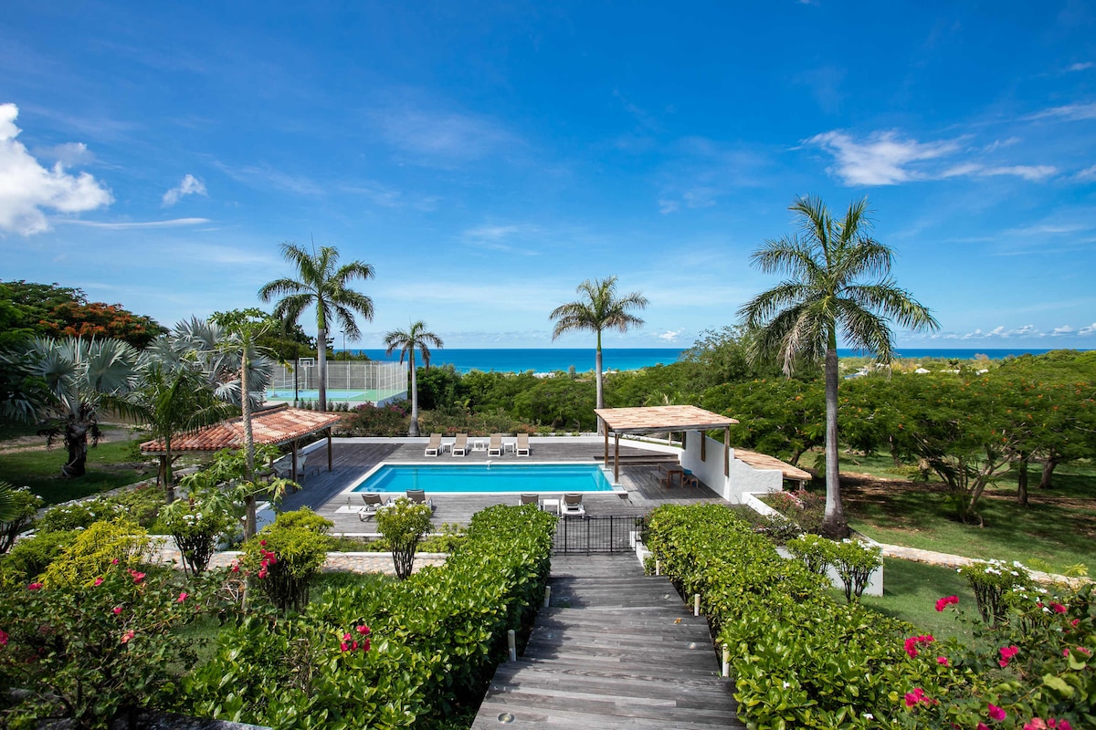 Villa La Hacienda is an elegant Spanish-Caribbean-style retreat, thoughtfully designed to embrace breathtaking views and outdoor living. This villa greets you with an inviting courtyard entrance, adorned with Old World wooden doors, lush gardens, and exotic plantings. The panoramic vista from the terraces captures a stunning spectrum of blues from the sea to the sky.
