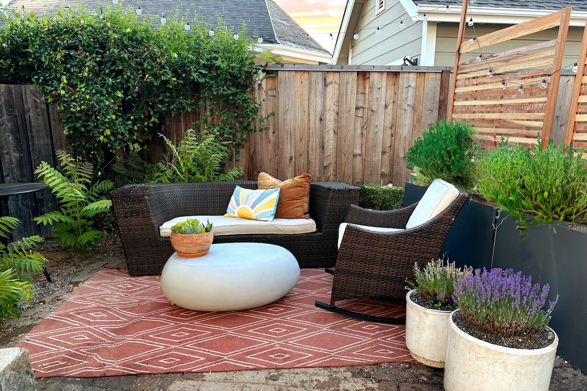 This sun-soaked suite has a private entrance and access to a beautiful garden patio, complete with night-time ambiance and a fireplace. The big bay window provides a view into the lush fruit, flower, and vegetable garden right outside. The comfy bed and beautiful old-town neighborhood add to the warm, homey feel. The suite is tucked away from the busiest parts of the city, perfect for a hub in the middle of NorCal's best attractions: SF, Carmel, Pebble Beach, Monterey, Santa Cruz, and more.