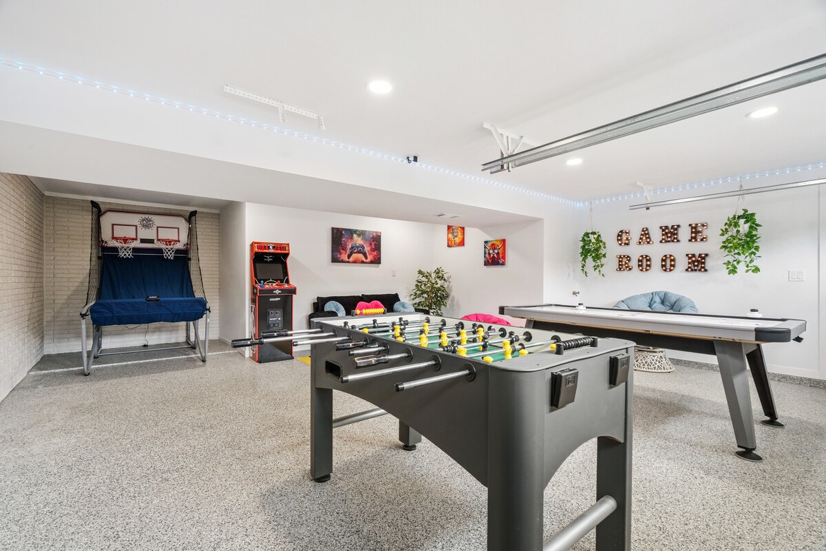 Welcome to our beautiful, spacious home with a full game room! Our incredible game room includes basketball, air hockey, foosball, and an arcade machine. Pop some popcorn and snuggle up by the fireplace for a movie in our theater room! The peaceful backyard patio is perfect for grilling, enjoying the sun and playing giant connect 4. Our kitchen is fully stocked and our bedroom sheets are luxurious. Our home is the perfect place to relax, have some fun, and connect with friends and family!