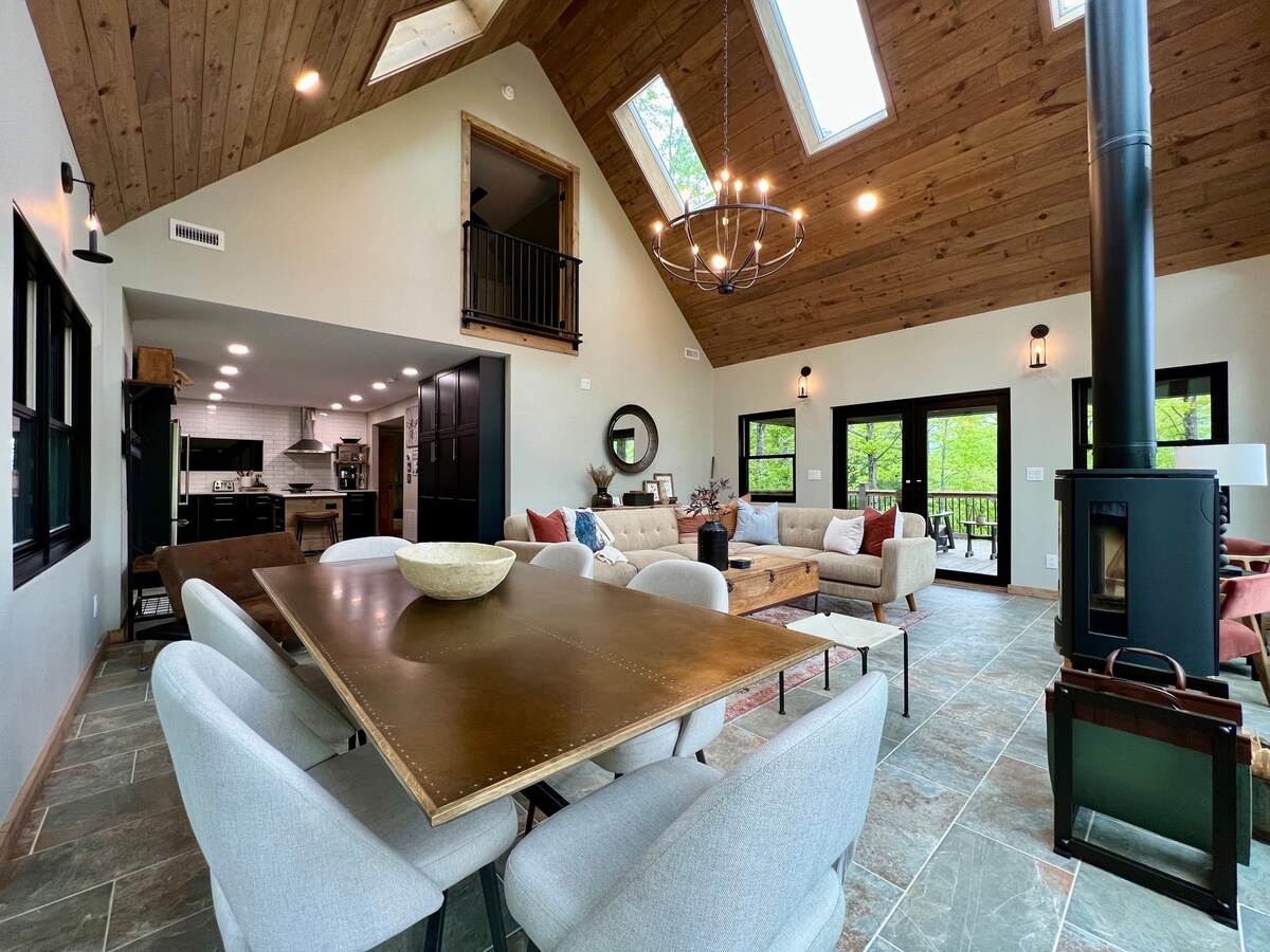 Descubre la mezcla perfecta de comodidad acogedora y aventura impresionante en nuestra casa de campo. Ubicada en lo alto de Blue Ridge Parkway, a una refrescante altura de 3500 pies, esta escapada ofrece una tranquilidad inigualable. Imagina tomar tu café de la mañana en la terraza privada, contemplando un mar de estrellas en el aire fresco de la montaña. Si bien te sentirás a kilómetros de todo, estás a pocos pasos de los encantadores restaurantes y tiendas locales. Explora la mundialmente famosa Escuela de Artesanía de Penland, los estudios Toe River Arts.