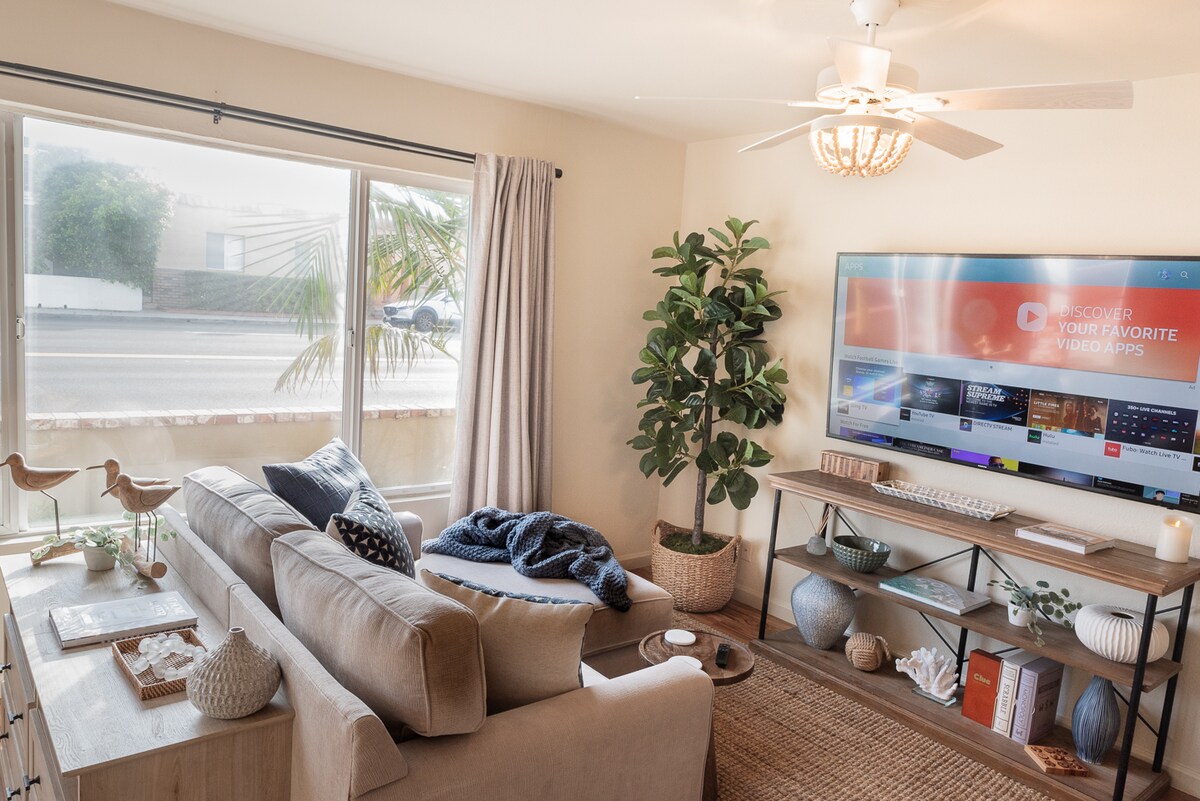 Los techos de rafter, los muebles de la granja costera y una paleta de colores de arena y blanqueada aportan las vibraciones tropicales al interior. Las familias pueden llevar juguetes a la playa para jugar junto a la orilla. Ubicado en el segundo piso e incluye un lugar de estacionamiento en el garaje. El bungalow está a una cuadra de la playa de Corona Del Mar, en las "calles de las flores", rodeado de casas multimillonarias. CDM Village, conocido por sus pintorescas tiendas, cafeterías, panaderías y restaurantes, está a la vuelta. Disneyland está a 20 millas de distancia.