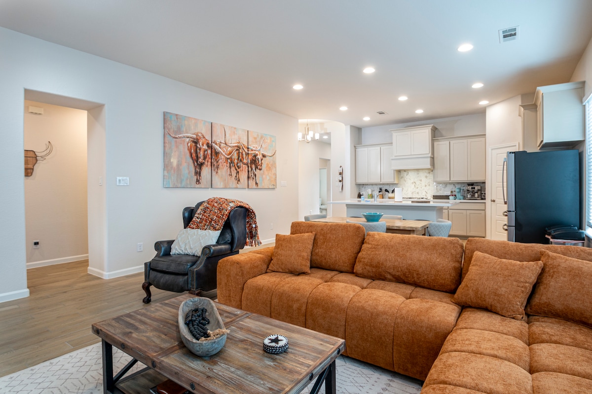 Relájate y recarga energías en esta elegante y cómoda escapada a Little Elm, perfecta para familias, viajes de negocios o unas relajantes vacaciones. Da un corto paseo hasta el lago Lewisville y relájate por las noches alrededor de la fogata bajo el cielo de Texas. Diseño abierto y luminoso diseñado para reuniones, electrodomésticos más nuevos, amplio dormitorio principal con cama tamaño king y escritorio para trabajo remoto, televisores inteligentes, lavadora/secadora, patio cubierto y sillas Adirondack. A minutos de Little Elm Beach, lanzamiento de barcos y lugar de bodas Knotting Hill Place.