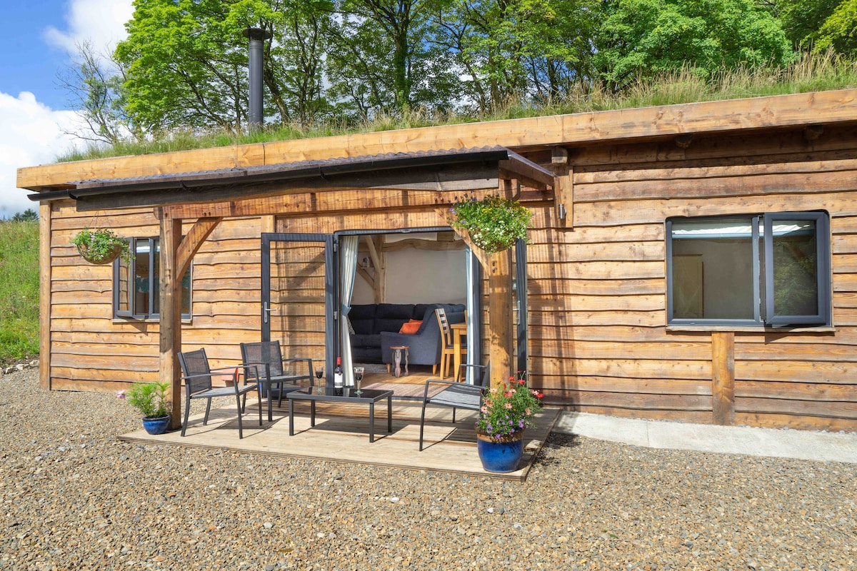 A spectacular unique hand crafted log cabin, built from oak beams and larch cladding sourced from our own woodland. Kept extra cosy by the grass “living roof” above. Its nestled in beautiful Welsh countryside in a quiet valley overlooking our 20 acre private woodland that you are welcome to walk in. PLEASE NOTE WE ARE ONLY ABLE TO ACCEPT SATURDAY TO SATURDAY BOOKINGS (7 NIGHTS STAY) FOR JULY AND AUGUST.