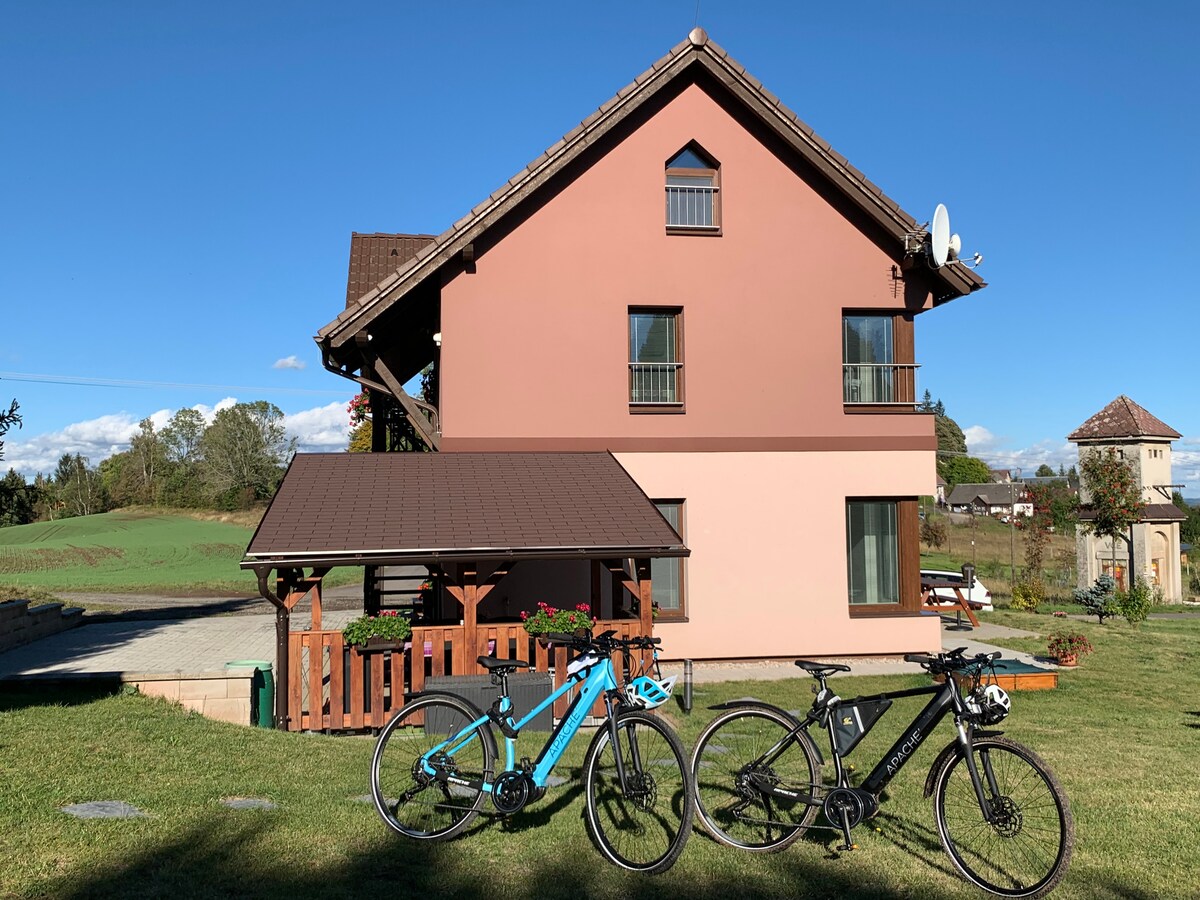 El alojamiento con las vistas más hermosas de Jičín y sus alrededores se encuentra en una granja con un establo, cuyos cimientos datan del siglo XVII. El amplio apartamento en el ático, recientemente renovado, ofrece a los huéspedes todas las comodidades y confort, TV Skylink, wifi de alta calidad, aparcamiento vigilado, parrilla. Los huéspedes experimentarán la atmósfera única de la vida en una granja con cría de caballos. La ubicación excepcional permite a nuestros huéspedes estar rodeados de la naturaleza de prados y pastos, y al mismo tiempo estar a poca distancia del centro histórico de Jičín