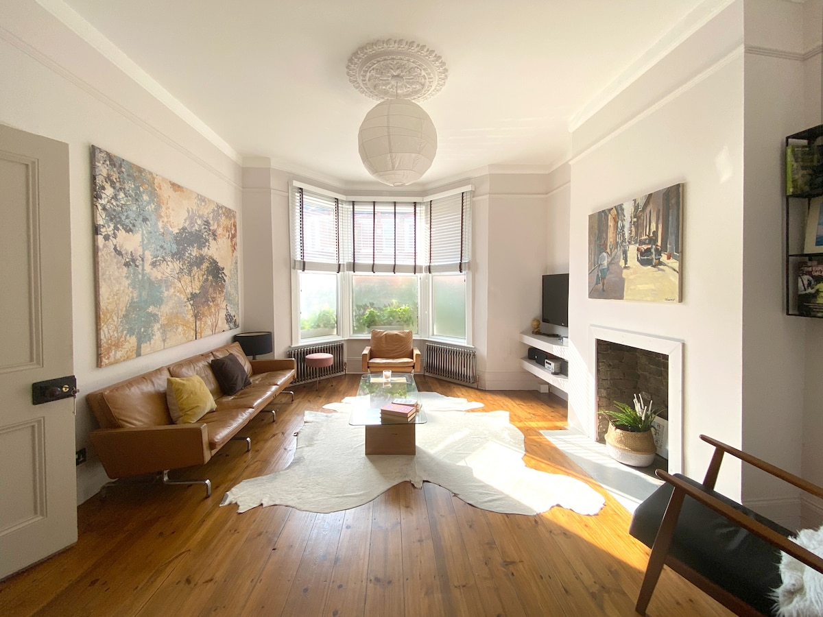Hermosa casa de artistas, espaciosa, llena de carácter y mucha luz natural. Se encuentra en la zona 2, muy bien comunicada con el centro de Londres a través de trenes y autobuses locales. Esta casa de 3 dormitorios tiene capacidad para 6 personas. Dos de las habitaciones tienen camas tamaño king (europeas), mientras que el tercer dormitorio cuenta con televisión y un sofá cama.