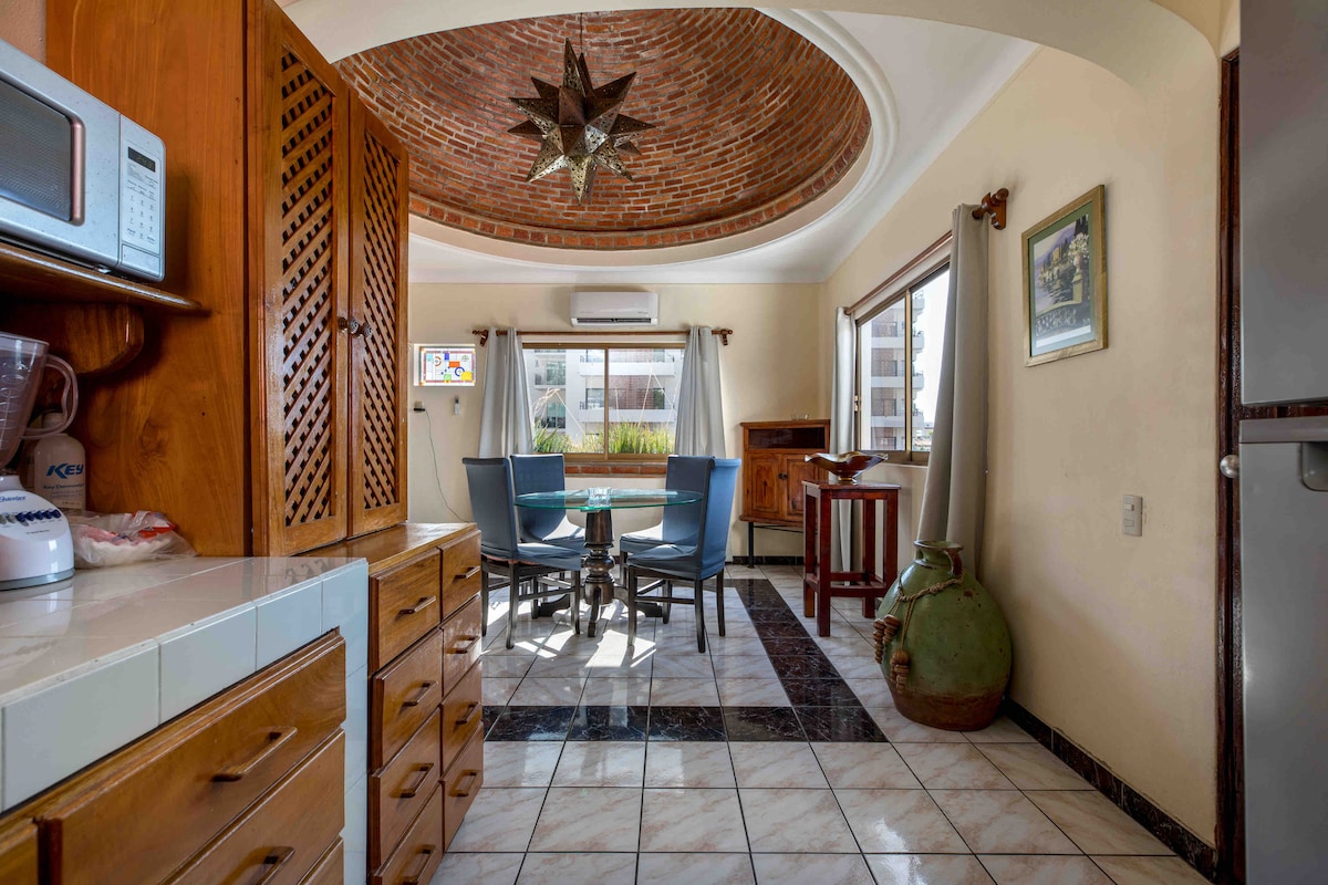 El Dorado 402 offers an iconic Puerto Vallarta getaway that folks can’t get enough of. Perched on the 4th floor with a balcony overlooking the original beach, its your private lookout to be entertained by seagulls, fishing boats, magical sunsets and panoramic views of Banderas Bay. Enjoy handmade furniture and art, natural Jalisco finishes, the sound of crashing waves, sea breezes and salty air. The interior design embraces the whimsical style that PV is famous for. Welcome to El Dorado 402.
