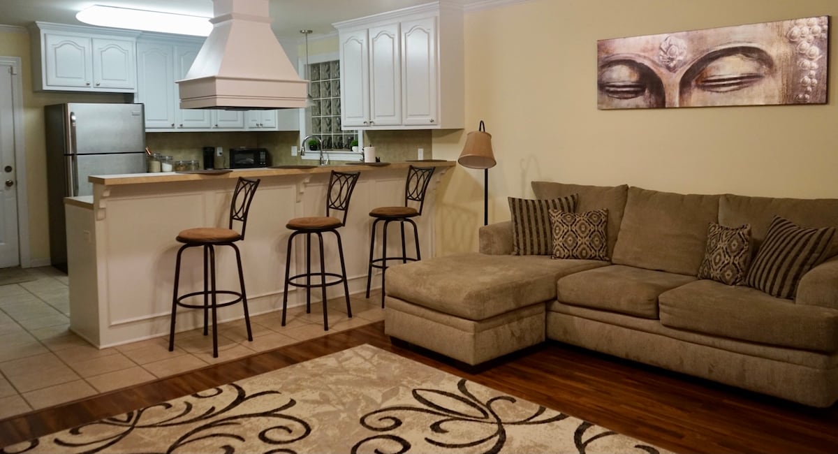 Este es un hermoso y cómodo apartamento tipo estudio ubicado en College Town, uno de los barrios más antiguos y bonitos de BR. Estarás a pocas manzanas de las puertas sur de LSU, a 5 minutos a pie de los lagos de LSU (con su circuito para caminar de 4 millas), a 12-15 minutos a pie del Tiger Stadium y cerca de muchos restaurantes excelentes y de la vida nocturna en el campus. Nuestro apartamento seguro y tranquilo es un lugar estupendo para estudiantes y padres visitantes, así como para viajeros de negocios y visitantes de BR.