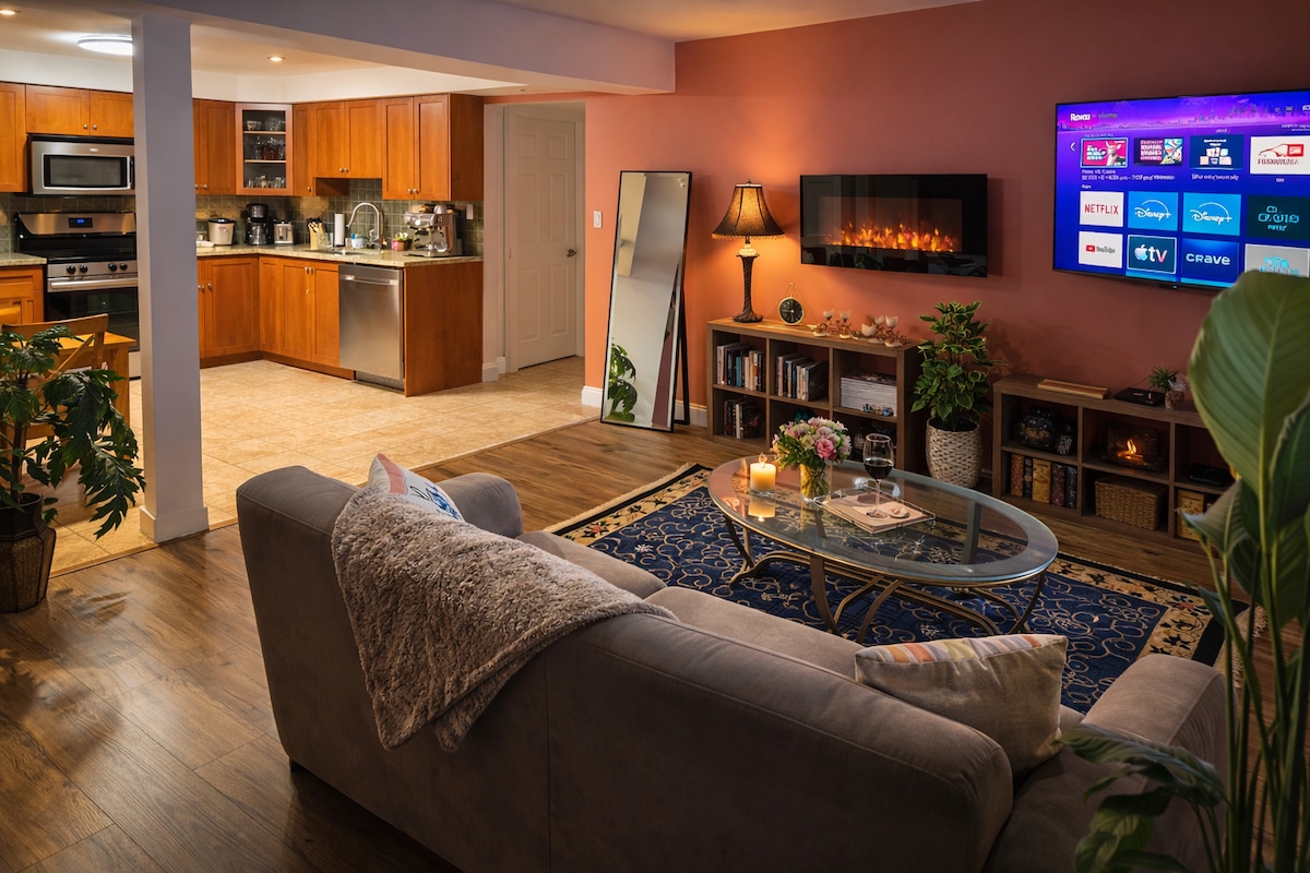 Suite privada en un sótano BR en una casa de nueva construcción. La suite tiene una cocina completa, una entrada privada y 1 baño completo con una combinación de ducha/bañera. Electrodomésticos: lavandería en suite, horno y cocina de tamaño completo, microondas, nevera y lavavajillas. ¡Mascotas y niños, bienvenidos! Cama tamaño king en el dormitorio separado con vestidor. Sofá cama doble extraíble en el salón. Equipo para bebés disponible. Cerca de tiendas y del mundialmente famoso Lynn Canyon Park. Nota: esta es una suite en el sótano subterráneo. Reg'n H335588166