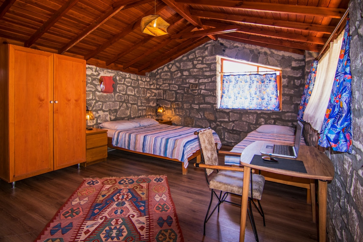 Bahçeye bakan Hürrem oda özel banyosu olan geniş bir oda., Bu oda da 1 çift kişilik yatak 1 tek kişilik yatak ve 1 bazalı yada portatif ek yatak eklenebiliyor ve böylece 4 kişi konaklanabilecek hale gelebiliyor.Taş bir rum evinde olduğu için yazın da serin olan Hürrem oda sensizliğin içinde bir vaha vaad ediyor sizlere.
