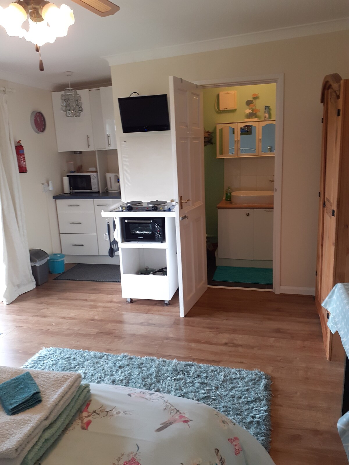 Un refugio tranquilo que ofrece paz y privacidad en un edificio independiente dentro de nuestro gran jardín. Puerta de entrada con cerradura con llave disponible a la llegada. El acceso wifi está incluido, lo que la mayoría de los huéspedes han encontrado perfectamente adecuado. Desayuno de cereales, pan, leche y (si se solicita) salchichas, tocino, huevos, etc. para que cocines tú mismo a la hora que más te convenga. Aunque no hay una cocina completa, hemos proporcionado un pequeño horno.