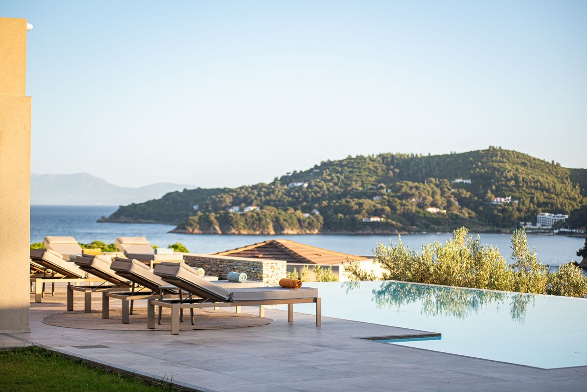 La fascinante Villa Pelagoon en el tranquilo pueblo de Achladies en la isla de Skiathos, es un hermoso ejemplo de minimalismo y arquitectura contemporánea. La elegante casa cuenta con vistas sublimes sobre el resplandeciente mar Egeo y es fácilmente una de las villas más excepcionales de la isla. Ubicado entre olivos y vegetación, es el refugio perfecto para aquellos que buscan tranquilidad y aislamiento durante su estancia.